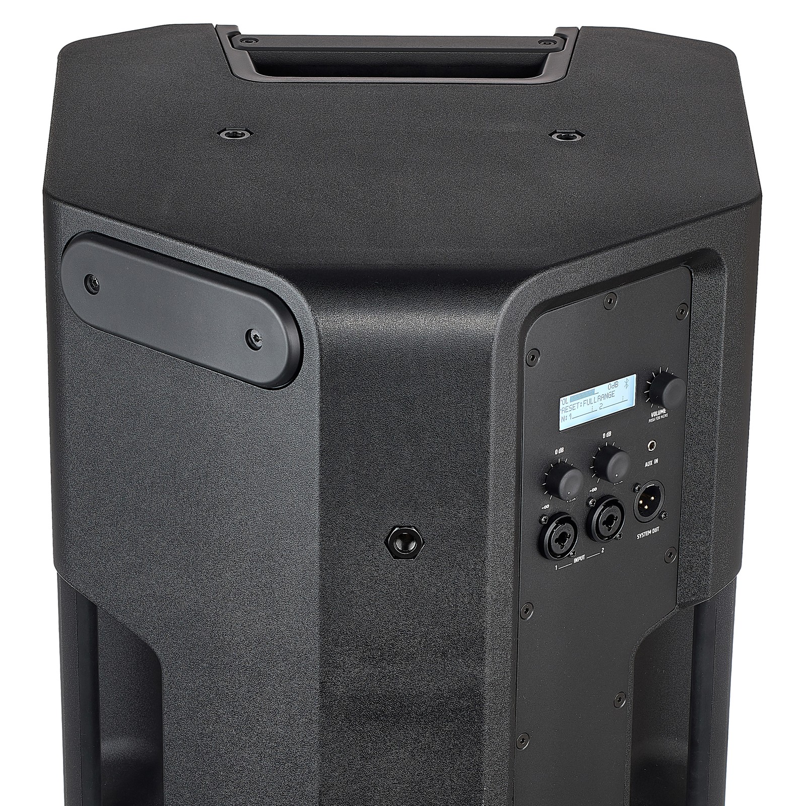 Der 12-Zoll-Basstreiber und das 1-Zoll-Horn werden von einem Class D-Verstärker angetrieben, der einen Schalldruck von bis zu 126 dB bei einer RMS-Leistung von 300 Watt liefert. Laut LD Systems® liegt der Übertragungsbereich des ICOA 12 A BT bei 50 bis 20.000 Hz. Die Bedienung des digitalen Signalprozessors, der ab Werk mit nützlichen Presets ausgestattet ist, erfolgt über den Encoder rechts neben dem Display, welcher gleichzeitig auch als Volume-Regler dient. Die Anschlussmatrix unterhalb des Displays verfügt über zwei Eingänge mit kombinierter XLR-Klinken-Buchse und Gain-Regler. Zusätzlich ist der ICOA 12 A BT mit einem 3,5-mm-AUX-Input ausgestattet, um eine direkte Verbindung mit mobilen Geräten zu ermöglichen. Der zur Verfügung stehende XLR-Ausgang leitet alle eingehenden Signale weiter.