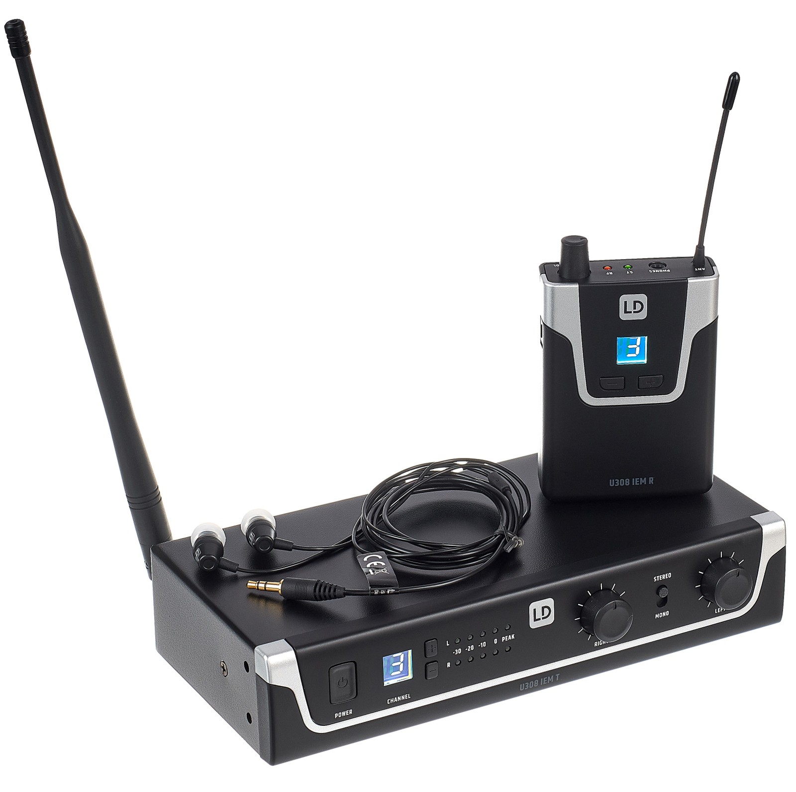 Das U308 IEM HP ist ein vergleichsweise preisgünstiges Set für schnurlosen Monitorsound. Das Frequenzband des analogen Funksystems darf gleich nach dem Auspacken genutzt werden, ohne dass eine Erlaubnis erforderlich wäre. Die Batterien im Bodypack halten mit bis zu zehn Stunden relativ lange. Auch die maximal mögliche Entfernung zwischen Sender und Empfänger von 100 Metern kann sich sehen lassen. Die Sendestrecke überträgt den Audiobereich von 50 bis 16000 Hz. Der Kopfhörer hat einen Frequenzgang von 30 bis 20000 Hz. Bis zu sechs dieser Strecken können gleichzeitig auf unterschiedlichen Kanälen dieses Frequenzbandes genutzt werden. Die Bedienung gelingt dank Kanalwahltasten an Beltpack und Receiver leicht. Für die Versorgung mehrerer Bandmitglieder mit demselben Monitormix können beliebig viele Bodypacks auf dieselbe Frequenz eingestellt werden. Das Funkset wurde ausgezeichnet mit dem German Design Award 2020 und dem reddot adward 2019.