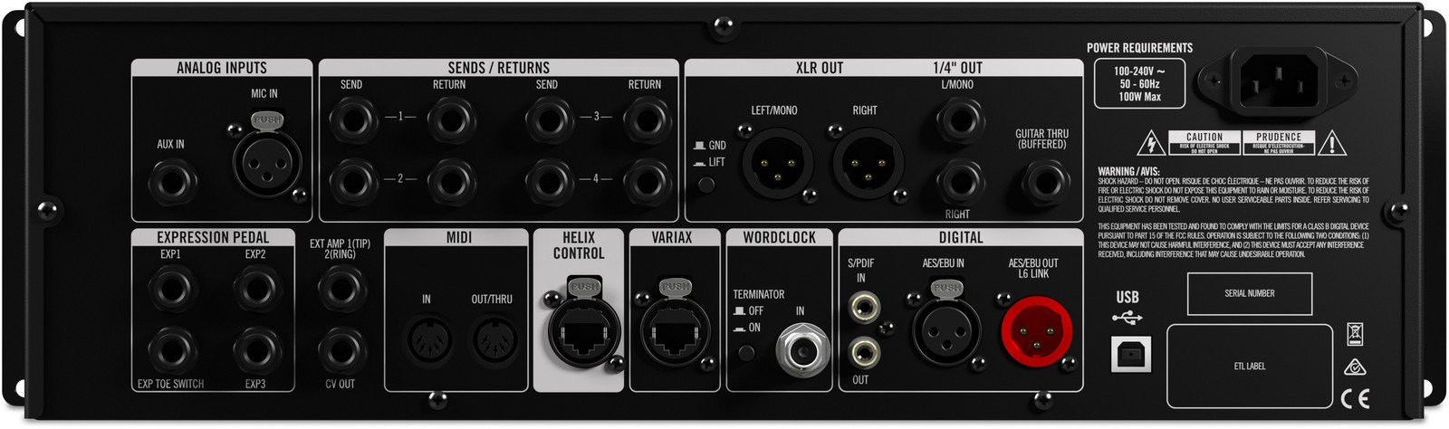 Helix Rack ist eine Universallösung für Gitarristen. Trotz kompakter Abmessungen lässt sich hier die gesamte Verstärkerkette ersetzen. Bei der Aufnahme ist man dabei überall und zu jeder Zeit einsatzbereit. Auf der Bühne überzeugt die professionelle Kombination von Rackgerät und robuster Steuereinheit durch enorme Klangvielfalt, bei Eliminierung von Pegel- und Konsistenzproblemen mikrofonierter realer Verstärker. Das Helix Control lässt sich dank langem Cat5/Ethercon-Kabel dort platzieren, wo man die Fußschalter auf der Bühne oder im Studio für Patchwechsel, Stimmgerät, Looper oder temporäre Effekte benötigt. Gleichzeitig ist Helix Rack aufgrund seiner Fähigkeiten als leistungsstarker Effektprozessor und als Boxensimulation auch ein idealer Partner für vorhandene reale Verstärker. Und schließlich ist das Gerät mit vier programmierbaren Effektloops, MIDI-Steuerbarkeit und dem übersichtlichen großen Display eine ideale Steuerzentrale für externe Hardware.