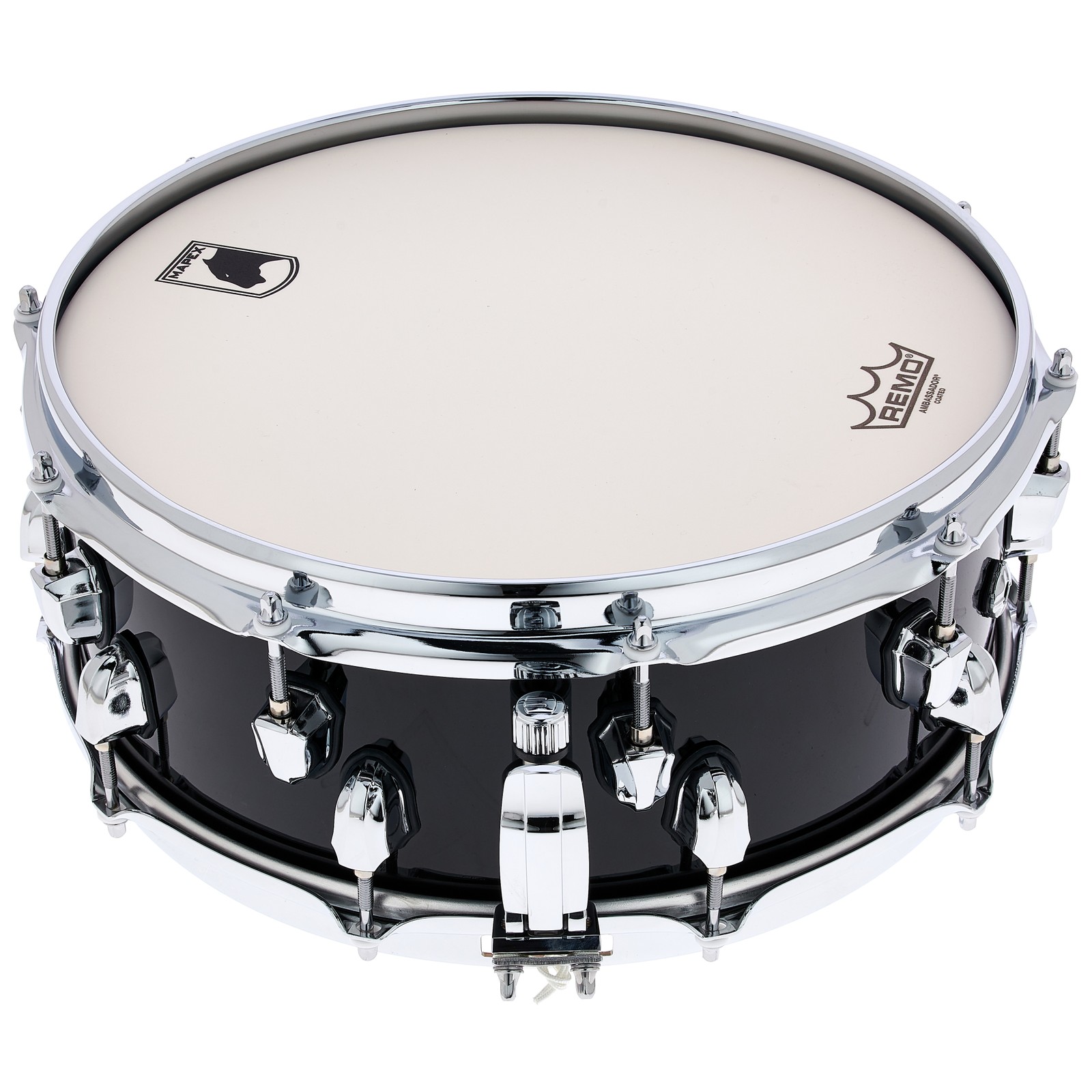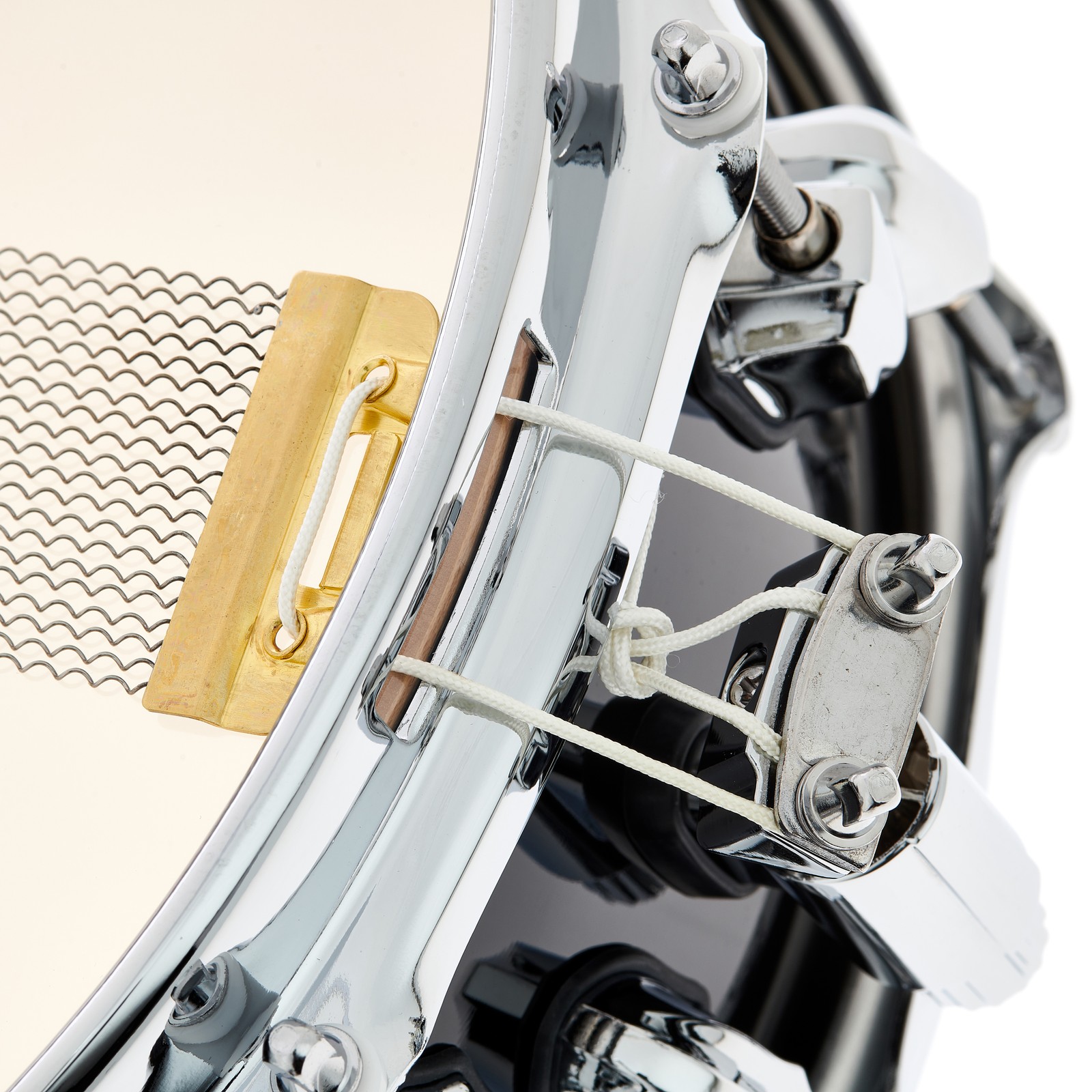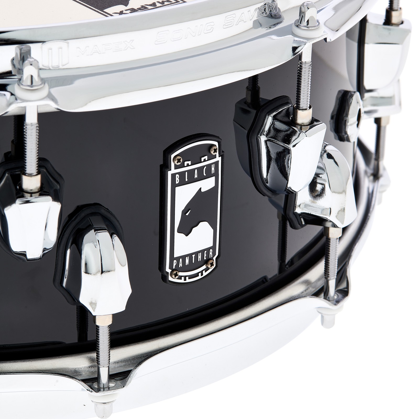 Die Black Panther Nucleus Snare von Mapex in 14“x5,5“ verfügt über SONIClear-Bearing-Edges. Diese Kesselgratungen (45°-Batter-Side, 35°-Snare-Side) mit abgerundeter Außenkante bieten gegenüber gewöhnlichen Gratungen eine vergrößerte Fellauflagefläche. Alle metallischen Anbauteile wie etwa die Staggered-1/8“-Offset-Locking-B-Lugs oder die Cylinder-Drive-Abhebung sind auf Gummiunterlagen montiert. Auf diese einfache Weise wird ein direkter Kontakt zum Kessel zugunsten einer möglichst ungehinderten Resonanzentfaltung vermieden. Klanglich sorgt die besondere Ahorn/Walnuss-Kombination für einen organischen, warmen Grundcharakter.