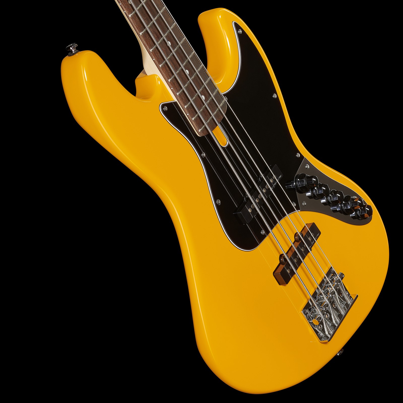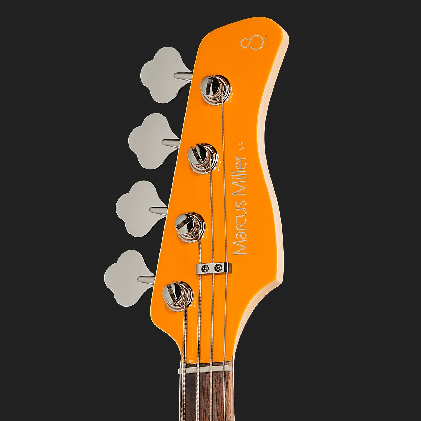 Ein Mahagonikorpus, ein Ahornhals und ein Palisandergriffbrett sind die Hölzer der Wahl für den Sire V3. Eine Besonderheit ist, dass die Enden der 20 Bundstäbchen sorgfältig abgerundet wurden, um Lagenwechsel so angenehm wie möglich zu machen. Wer J-Bässe mag, wird mit den Maßen von 38mm Sattelbreite, 34 Zoll Mensur und dem C-förmigen Halsprofil auf Anhieb bestens klarkommen. Zwei Marcus Standard Jazz Bass Revolution Single Coils und die Heritage 3-Band Elektronik (dank 18 Volt Betriebsspannung stets verzerrungsfrei) sind die Schaltzentrale für eine enorme Bandbreite an Sounds. Zur Wahl stehen der klassische Passiv-Modus inklusive Höhenblende oder die Aktiv-Elektronik mit Reglern für Bässen, parametrischen Mitten und Höhen. Das poppige Orange Finish hebt sich definitiv vom Mainstream ab und macht den V3 auf jeder Bühne zu einem Hingucker.