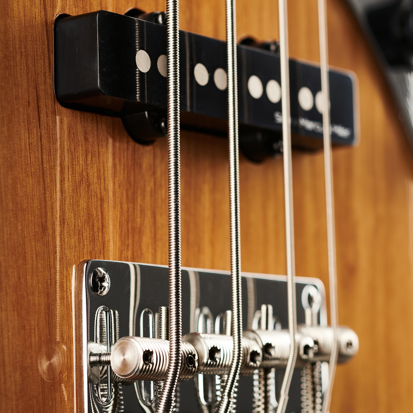 „Never Change A Running System“ ist eine alte Weisheit und dies gilt auch für den J-Bass. Eine Korpus aus Erle und ein Hals bzw. Griffbrett aus Ahorn habe sich über Jahrzehnte bewährt und kommen auch beim Sire V5 zum Einsatz. Durch ein thermisches Verfahren (Roasted) werden Hals und Griffbrett deutlich unempfindlicher gegenüber klimatischen Schwankungen und bekommen einen schönen Karamell-Ton. Weitere Optische Highlights sind das Transparente Finish und die coolen Blockinlays des Griffbretts. Die hauseigenen Marcus Vintage-J Revolution Jazz Single Coils bilden die klangliche Zentrale des V5. Ganz wie beim großen Vorbild hat jeder Tonabnehmer seinen eigenen Volume-Regler und für beide zusammen gibt es eine passive Tonblende, um den Sound den eigenen Wünschen anzupassen.