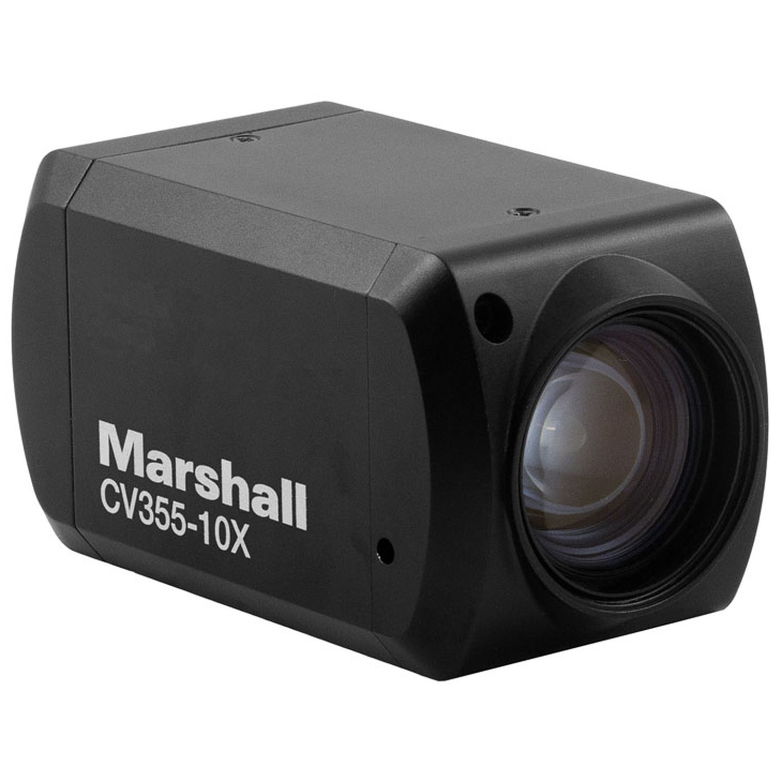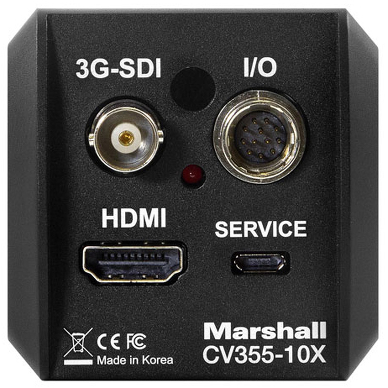 Die Marshall Electronics CV355-10X ist eine leistungsstarke Full-HD-Kamera im handlichen Blockformat. Mit nur zehn Zentimetern Tiefe und etwa fünf Zentimetern Breite und Höhe lässt sie sich an vielen Orten unauffällig installieren. In ihrem robusten Metallgehäuse schlummert ein professioneller 2-Megapixel-Sensor, der scharfe, rauscharme Videos mit einer maximalen Auflösung von 1.920 x 1.080 Pixeln und bis zu 60 Bildern pro Sekunde liefert – und das auch bei ungünstigen Lichtverhältnissen. Ausgeben wird das Signal simultan über den HDMI-Ausgang und die BNC-Buchse (3G-SDI) auf der Rückseite der Kamera. Die CV355-10X bietet ein Objektiv mit 10-fach optischem Zoom (4,7 bis 47mm), der von einem 12-fach-Digitalzoom ergänzt wird.