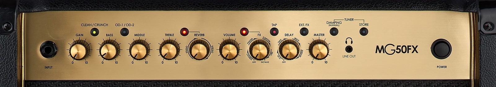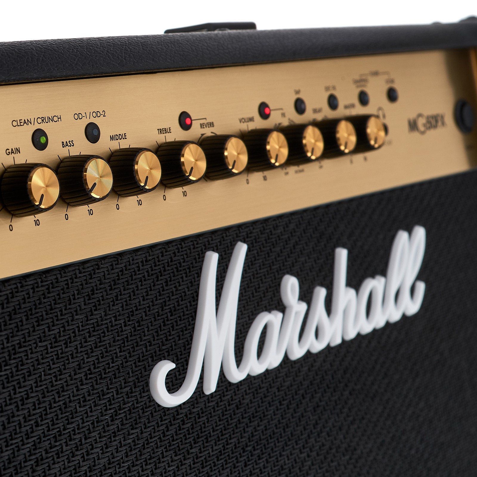 Der Marshall MG50GFX ist ein Gitarrencombo mit einem 12“ Lautsprecher und 50 Watt Leistung, der mit seinen integrierten Effekten und den reichhaltigen Anschlüssen speziell für Einsteiger entwickelt wurde. Die vier verfügbaren Kanäle Clean, Crunch, Overdrive 1 und 2 decken eine große Bandbreite an Klängen ab, die zusammen mit dem Dreiband-EQ und den zwei FDD-Modes (Frequency Dependent Damping) der Endstufe dem persönlichen Geschmack bzw. den Anforderungen angepasst werden können. Mit an Bord befinden sich die wichtigsten digitalen Effekte wie Reverb, ein Delay mit Tap-Tempo-Button und vier Charakteristiken, Chorus, Flanger, Octaver, Phaser und Vibe. Zudem sorgt ein serieller FX-Loop für das nahtlose Einbinden weiterer externer Effekte. Der Kopfhöreranschluss mit seinem emulierten Frequenzgang ermöglicht zusammen mit dem MP3/Line Eingang ein ungestörtes Üben, während der im Lieferumfang enthaltene Fußschalter für die Auswahl der vier einzelnen Kanäle dient.