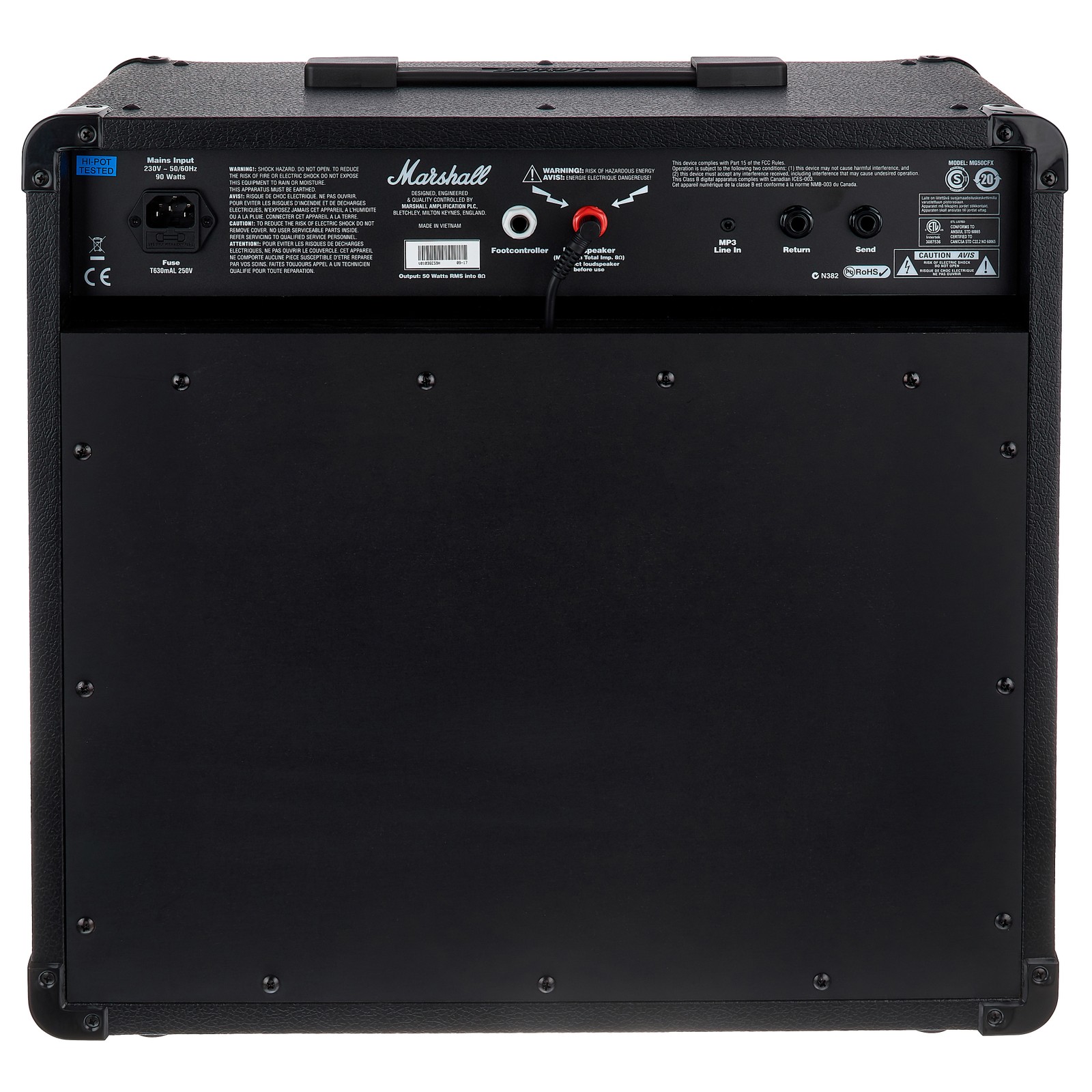 Auf dem übersichtlichen Bedienpanel lassen sich im Handumdrehen die gewünschten Sounds kinderleicht erstellen. Einfach per Knopfdruck zwischen den gewünschten Grundsounds wählen, den EQ nach Geschmack einstellen, je nach Bedarf die Effekte dazu mischen und wenn es perfekt ist, genügt ein Druck auf den Store-Button, um das Ergebnis dauerhaft abzuspeichern. Welchen der vier Kanäle man auch immer auswählt: Der Sound klingt stets typisch Marshall und besitzt durch die kraftvolle 50-Watt-Endstufe und den 12“ Speaker genügend Reserven, um sich auch in einem Bandgefüge souverän durchzusetzen. Und sollte doch einmal mehr Power benötigt werden, so kann eine zusätzliche Box an der Rückseite angeschlossen werden. Ein besonderes Feature bietet der FDD-Modus, mit ihm lässt sich zwischen einem klassischen Sound und einem modernen Ansprechverhalten der Charakter des Amps bestimmen.