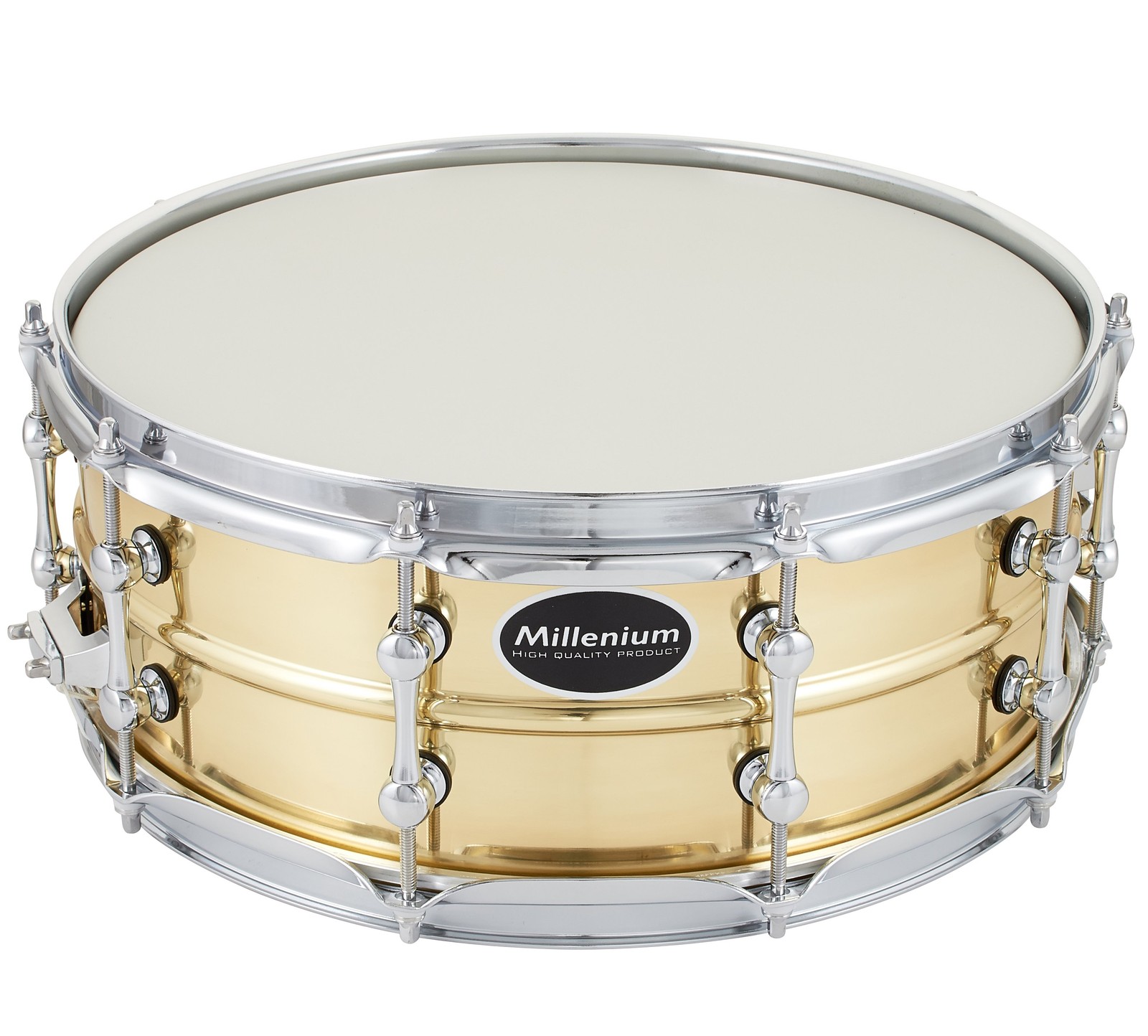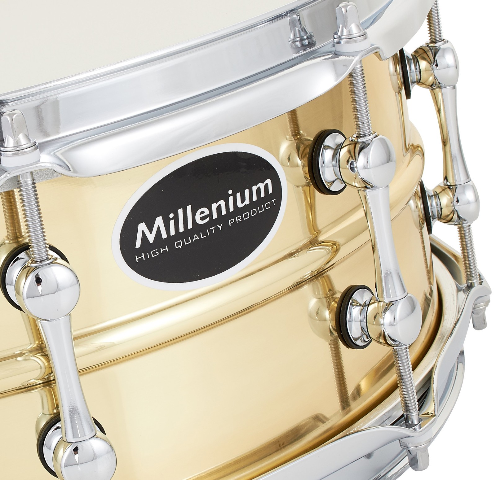 Die Millenium Power Brass Snare mit den Maßen 14“ x 5,5“ besitzt einen 1,2 mm starken Messingkessel, der mit einer stabilisierenden Sicke ausgestattet ist und den für Messing typischen warmen Sound erzeugt. Die 2,3 mm starken Stahlspannreifen werden mithilfe von 20 Schrauben gehalten, die in zehn „Classic Bridge“-Lugs ihren Platz finden. Das sind zwei Spannböckchen mehr als in diesem Preissegment üblich sind. Hierdurch wird ein sehr präzises Stimmen der Felle ermöglicht.
