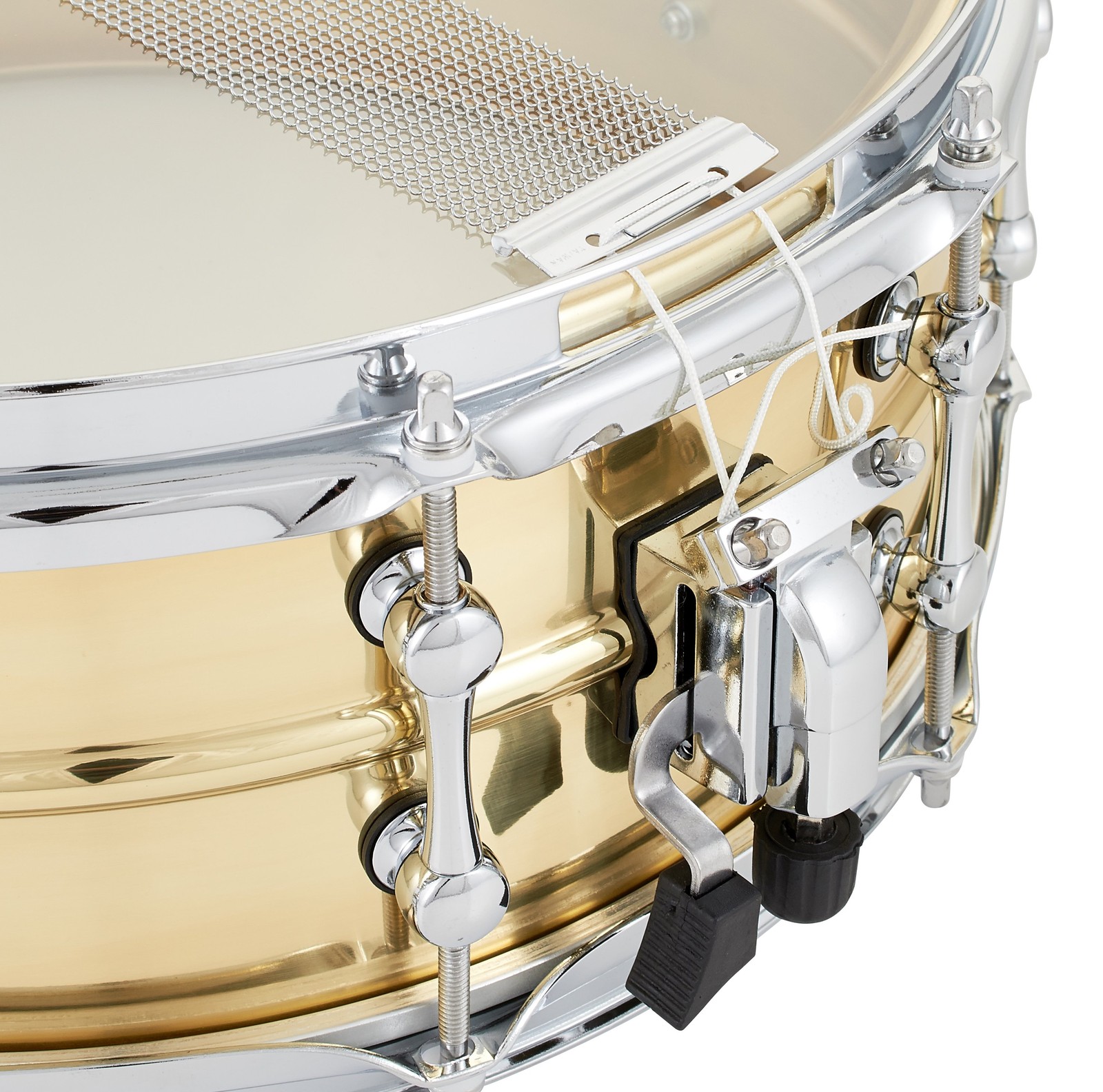 Die Messingsnare liefert einen überzeugenden Sound, der sich vor allem in mittleren und höheren Stimmlagen mit dem von kostenintensiveren Snares messen kann. Bei mittlerer Stimmung entwickelt die Trommel einen Charakter, der dank der ausgewogenen Klangeigenschaften des Kesselmaterials einen universell einsetzbaren Sound hervorbringt. Am Kessel ist eine einfach ausgeführte Abhebung angebracht, mit der sich die Spannung des 20-spiraligen Snareteppichs verändern lässt. Die ansprechende Messingoptik und die sauber verchromten Metallteile sorgen zudem für einen echten Hingucker.