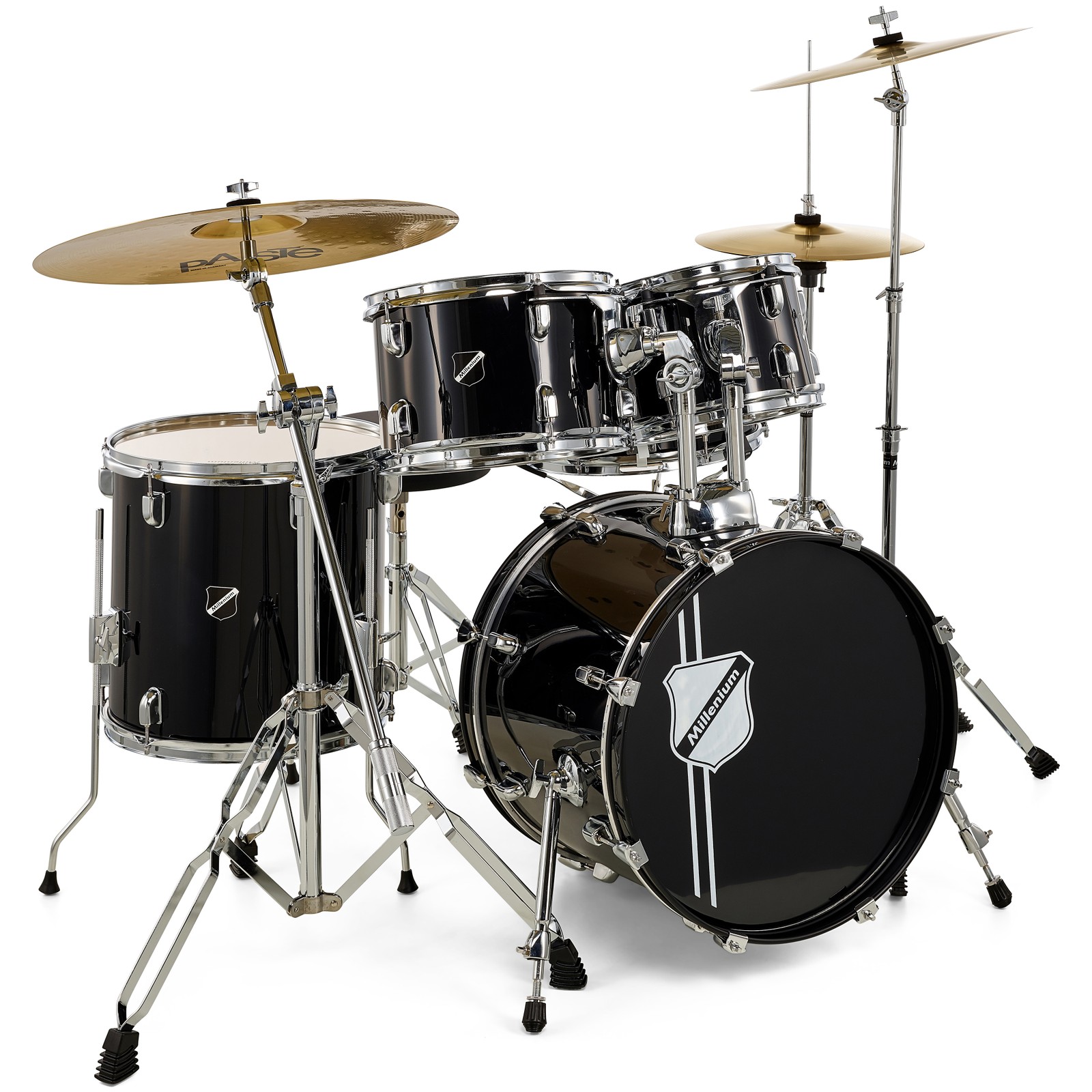 Das Millenium Focus 18 Drum Bundle Black ist ein Rundum-sorglos-Paket für die ersten Takte ambitionierter Einsteiger. Es bietet „out of the box“ alles, um nach dem Auspacken, Aufbauen und Stimmen direkt loslegen zu können. Neben dem fünfteiligen Kesselsatz sind zunächst zwei Becken (14“-Hi-Hat, 16“-Crash/Ride), alle benötigten Ständer inkl. Hi-Hat-Ständer, eine Fußmaschine für die Bass Drum und auch ein Schlagzeughocker im Lieferumfang enthalten. In dieser Preisklasse fast schon sensationell: die stabile, doppelstrebige Hardware sowie ein überaus nützliches Zubehörset mit einem Dämpfkissen für die Bass Drum, vier Soundringen für Snare Drum und Tomtoms sowie ein erstes Paar Drumsticks. Exklusiv in der Bundle-Version des Millenium Focus 22: ein zusätzliches 20“-Ride-Becken von Paiste sowie ein dazu passender Beckenständer mit Galgenarm.
