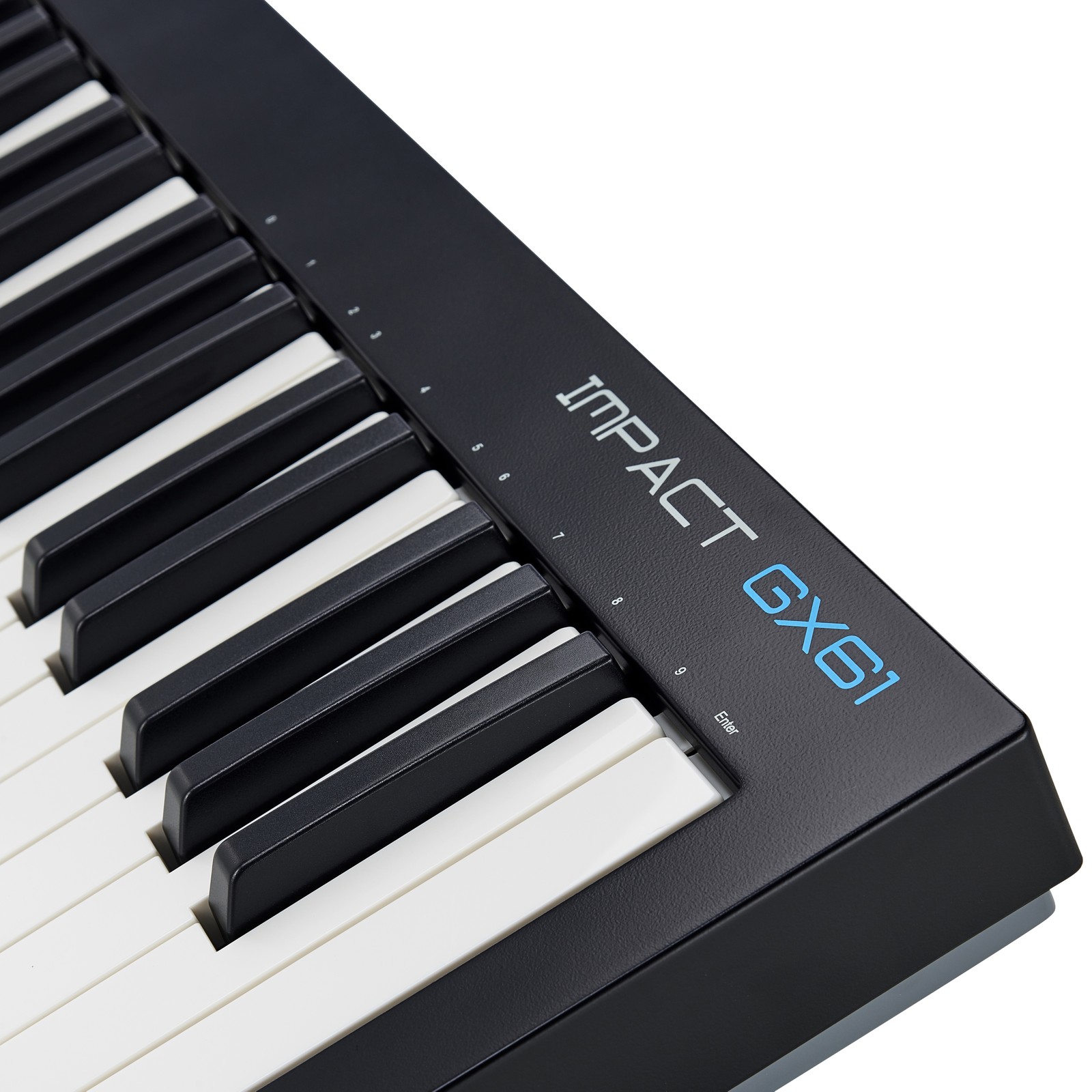 Das Impact GX 61 ist ein Keyboard, dessen Tastaturumfang auf expressives polyphones und solistisches Spiel mit samplebasierten Instrumenten sowie Synthsounds ausgerichtet ist. Die integrierte DAW-Steuerung unterstützt neben den üblichen Play/Stop/Record-Funktionen auch die Aktivierung von Loop und Click sowie die Umschaltung von Tracks. Damit können mehrere Spuren eines Songs flüssig nacheinander eingespielt werden. Die Stromversorgung erfolgt über USB, sodass das Keyboard leicht mit einem Laptop zu einem mobilen Set kombiniert werden kann. Ebenso ist ein Betrieb mit iOS-Geräten über ein optionales Apple Camera Connection Kit möglich. Zum Lieferumfang gehört die DAW Bitwig 8-Track, mit der sich kleinere Projekte schnell umsetzen lassen.