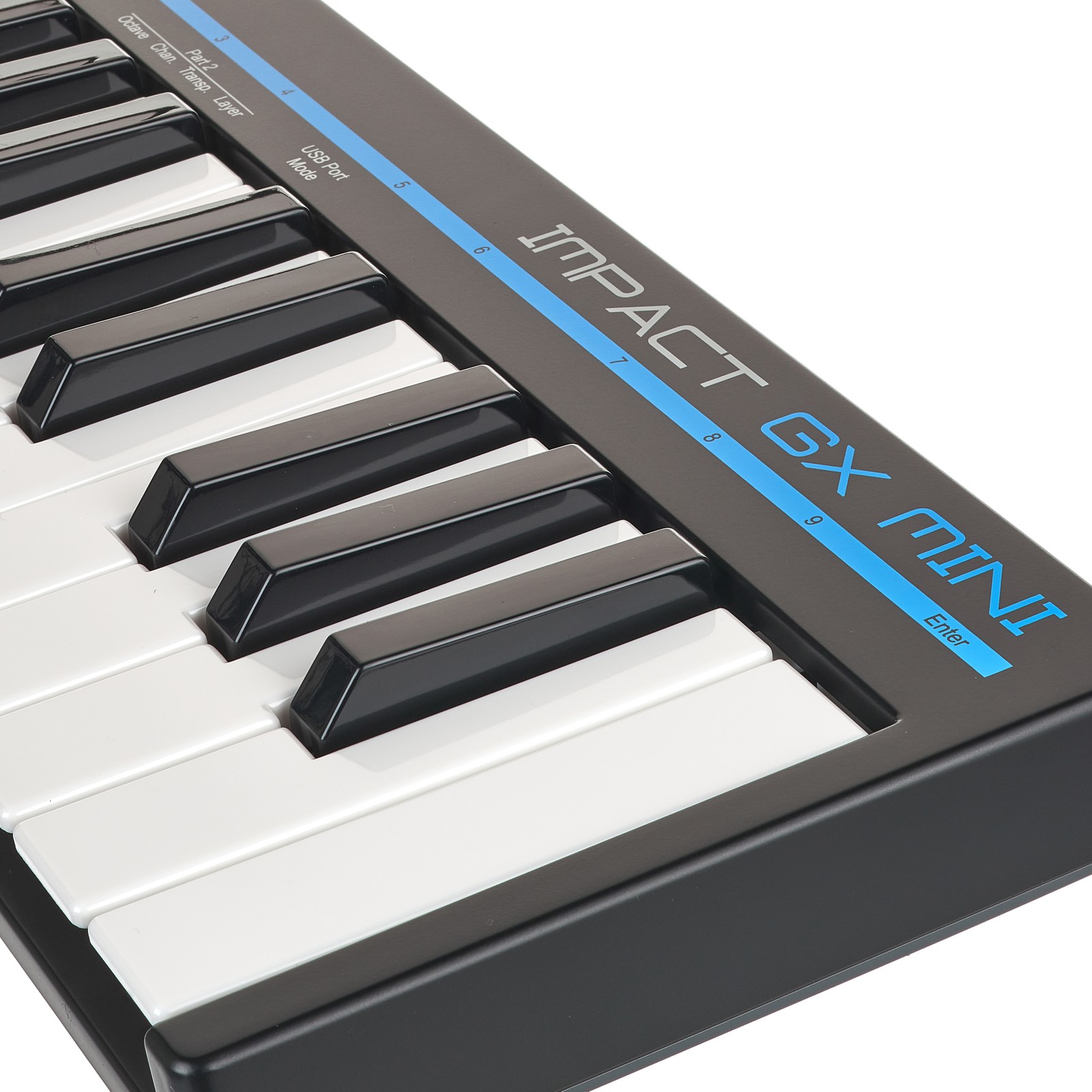Impact GX Mini ist das extra kleine Keyboard der GX-Serie. Es unterscheidet sich von anderen Modellen durch seine neu entwickelte Tastatur mit 25 anschlagdynamischen Minitasten, bei der Pitch- und Mod-Wheel durch einen handlichen Joystick ersetzt wurden. Das Minimodell verfügt, wie alle Keyboards dieser Reihe, über eine komfortable DAW-Fernsteuerung, die es einzigartig in dieser Preisklasse macht. Das kompakte Keyboard ist vor allem für mobile Setups ausgelegt, wodurch man seine Ideen ortsunabhängig in einen Softwaresequenzer einspielen kann. Die Transportfunktionen des Sequenzers lassen sich direkt vom Keyboard aus bedienen. Mit der Zweitbelegung der Tasten steuert man noch weitere DAW-Funktionen an. Für die gängigsten DAWs erfolgt die Anpassung sogar automatisch. Dank Class Compliance ist das USB-Keyboard nach dem Anschließen sofort einsatzbereit und läuft unter MacOS, Windows sowie Linux.