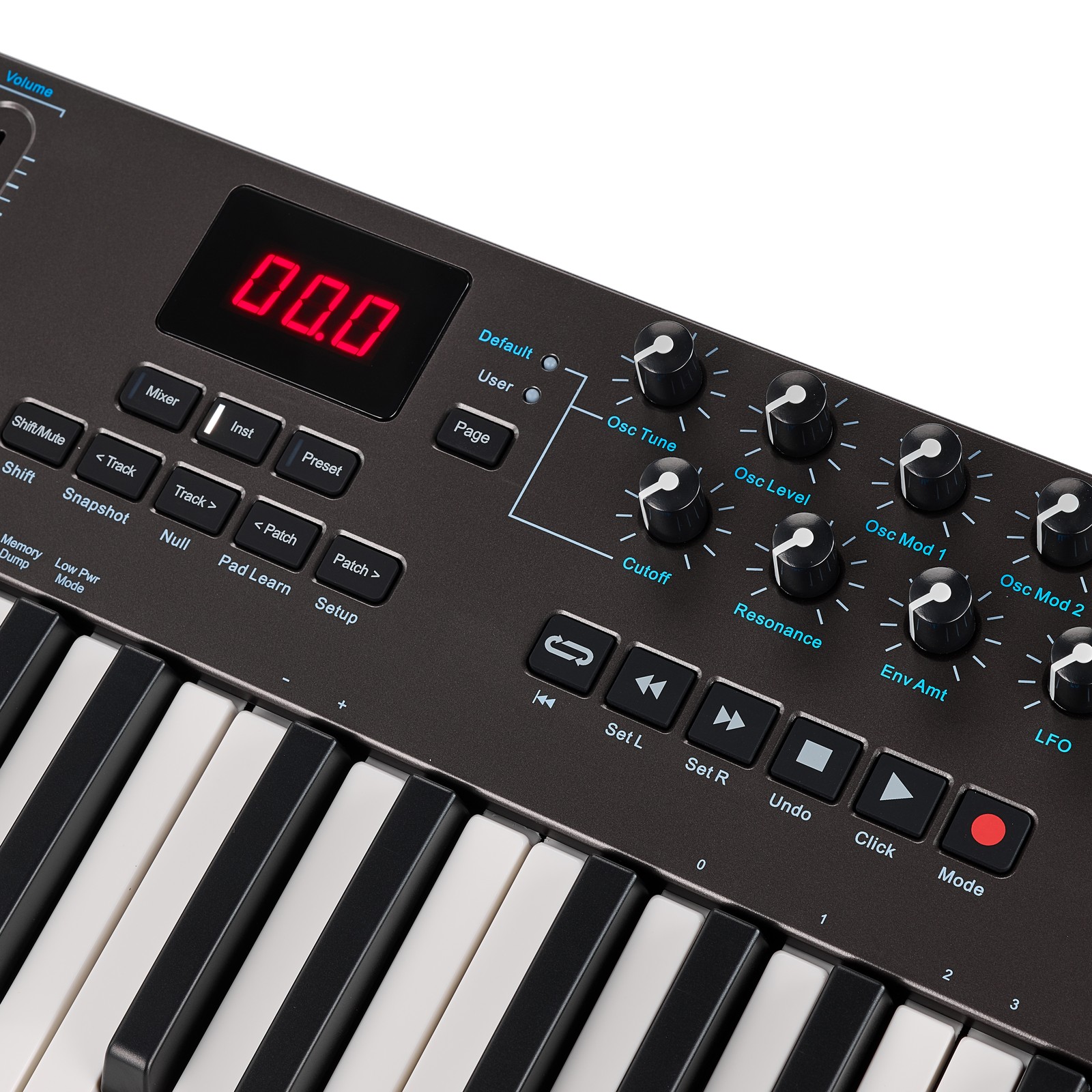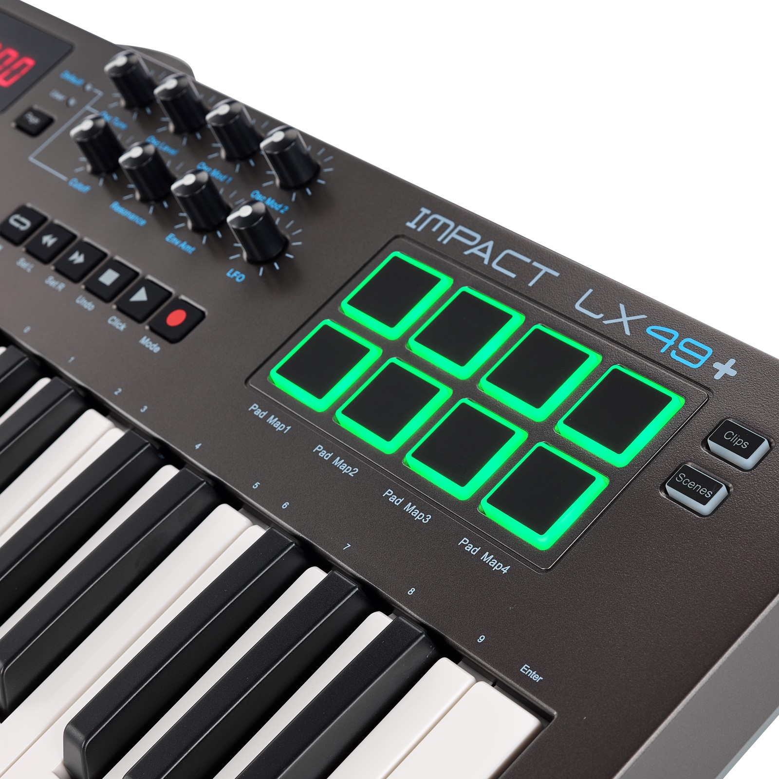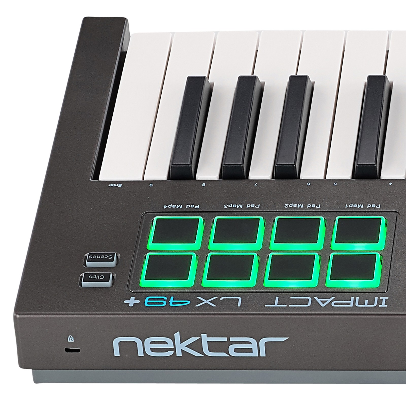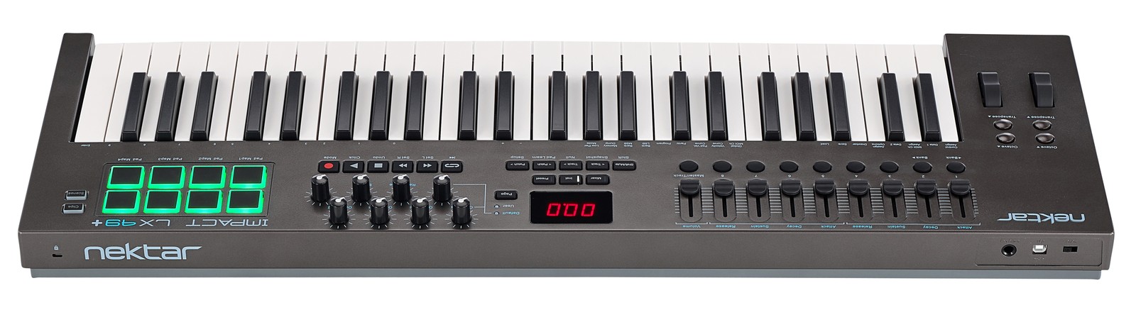 Der Nektar Impact LX49+ ist ein USB-MIDI-Controller-Keyboard mit 49 anschlagsdynamischen Tasten sowie Pitchbend- & Modulationsrad. Darüber hinaus verfügt er über acht Drum-Pads, neun Fader, acht Dreh-Potis, sechs Transport-Taster und neun Tasten, die mit einer Vielzahl von MIDI-Befehlen belegt werden können. Auf der Rückseite findet sich ein Anschluss für ein Sustainpedal, ein MIDI-Out und eine USB-Buchse. Mit seinen speziellen Performance-Control-Funktionen haben Musikproduzenten mehr Möglichkeiten zum Steuern aller gängigen DAWs, an die der Impact LX49+ bestens angepasst ist. Dank dieser vielfältigen Ausstattung bewährt er sich für die unterschiedlichsten Recordings im Studio.