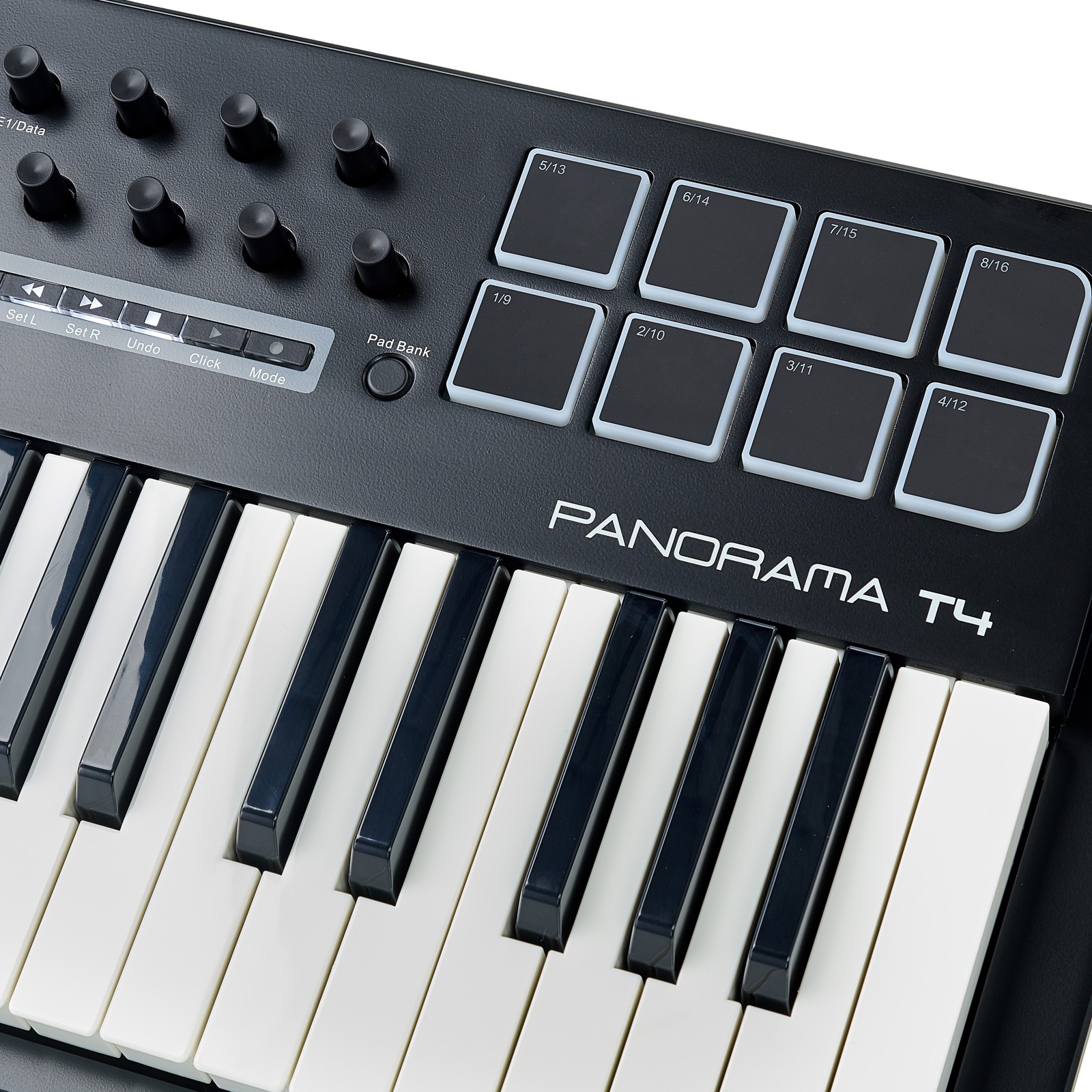 Das Nektar Panorama T4 ist ein Keyboard mit einer 2nd Generation Synth Action-Tastatur und vielfältigen Controller-Möglichkeiten. Mit Tasten, Fadern, Encodern und Pads gibt es die passenden Bedienelemente zur Ansteuerung der unterschiedlichsten Plugins. Die Ausstattung wird durch eine komfortable Transport-Steuerung für alle gängigen DAWs komplettiert. Zum einen kann das Keyboard über das Display an die anzusteuernden Geräte angepasst werden, andererseits lassen sich die Bedienelemente auch über die Software Nektarine für Synthesizer- und FX-Plugins mit wenigen Klicks mappen. Mit der Repeat-Funktion, die separat für Keyboard und Pads genutzt werden kann, lassen sich zum Beispiel Drum-Flams und rhythmische Noten/Chord-Trigger spontan und kreativ performen.