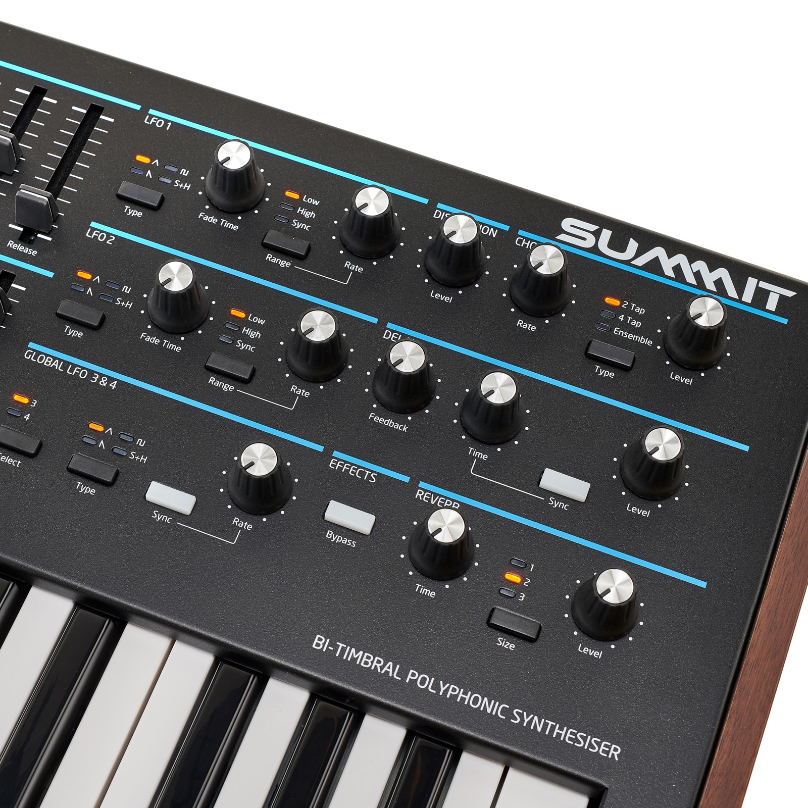 Jede der drei 16 Stimmen kann auf drei Oszillatoren zurückgreifen, welche über die Wellenformen Sinus, Dreieck, Sägezahn und Puls verfügen. Außerdem kann aus 15 Wavetables ausgewählt werden. Ein Rauschgenerator ist ebenfalls auswählbar. Die drei Oszillatoren besitzen Regler zur Grob- und Feinstimmung, daneben lassen sich mit Shape weitere Modifikationen der Wellenform umsetzen. Der Summit verfügt über analoge VCAs, einen Ringmodulator und drei analoge Distortion-Stufen pro Stimme. Das analoge Multimode-Filter hat eine umschaltbare Flankensteilheit von 12 bzw. 24 dB pro Oktave und lässt sich als Tief-, Band- und Hochpassfilter betreiben. Das Filter lässt sich pro Stimme im Doppelmodus fahren. Als Eingänge sind zwei Line- und ein CV-Mod-Eingang sowie zwei Eingänge für Fußpedale für die Dauer- oder die Schaltfunktion vorhanden. Geboten werden zwei Line- und AUX-Ausgänge und ein 6,3-mm-Kopfhörerausgang, MIDI-In/Out/Thru und ein USB-Anschluss zur MIDI-Kommunikation .