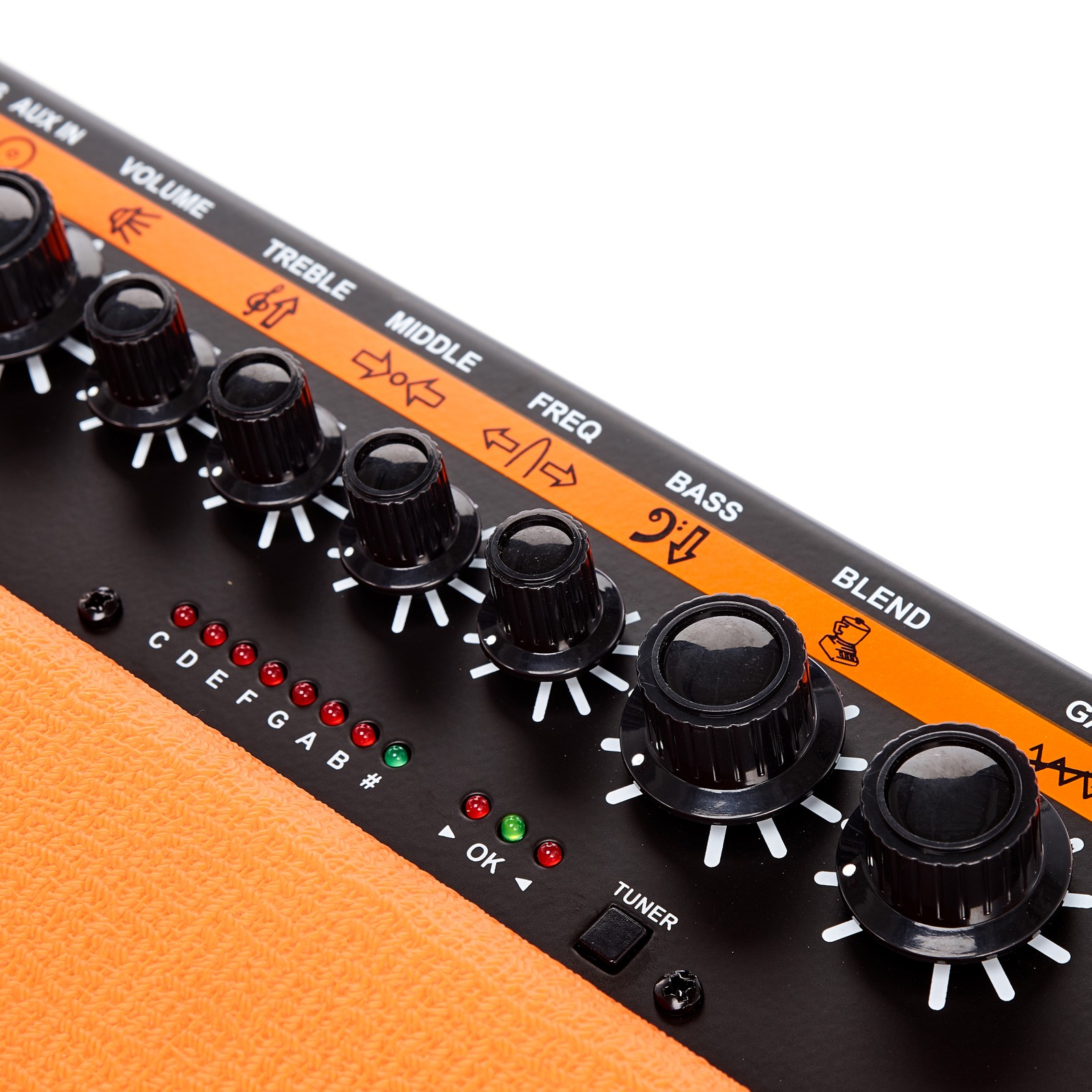 Unter der Haube des Orange Crush 100 verbirgt sich ein 15-Zoll-Lautsprecher, der von einer analogen Endstufe mit 100 Watt Leistung befeuert wird. Mit dem 3-Band-Equalizer lässt sich der rockige Grundsound noch feintunen. Ein Highlight ist sicher die proprietäre Verzerrung, welche sich sowohl in der Intensität (Gain) als auch im Mischungsverhältnis (Blend) regeln lässt. Somit ist von mild bis brachial alles möglich. Die Aktivierung der Verzerrung kann auch über einen optionalen Fußschalter erfolgen. Für das stille Üben zu Hause stehen ein Kopfhörerausgang und ein Aux In (beispielsweise fürs Handy) zur Verfügung und sogar ein Stimmgerät ist integriert. Dank seiner zwei seitlichen Schalengriffe lässt sich der Orange Crush 100 rückenfreundlich transportieren. Wer es auffällig mag, nimmt den Crush 100 im typischen Orange-Look, wer es klassischer bevorzugt, wählt einfach die schwarze Variante.