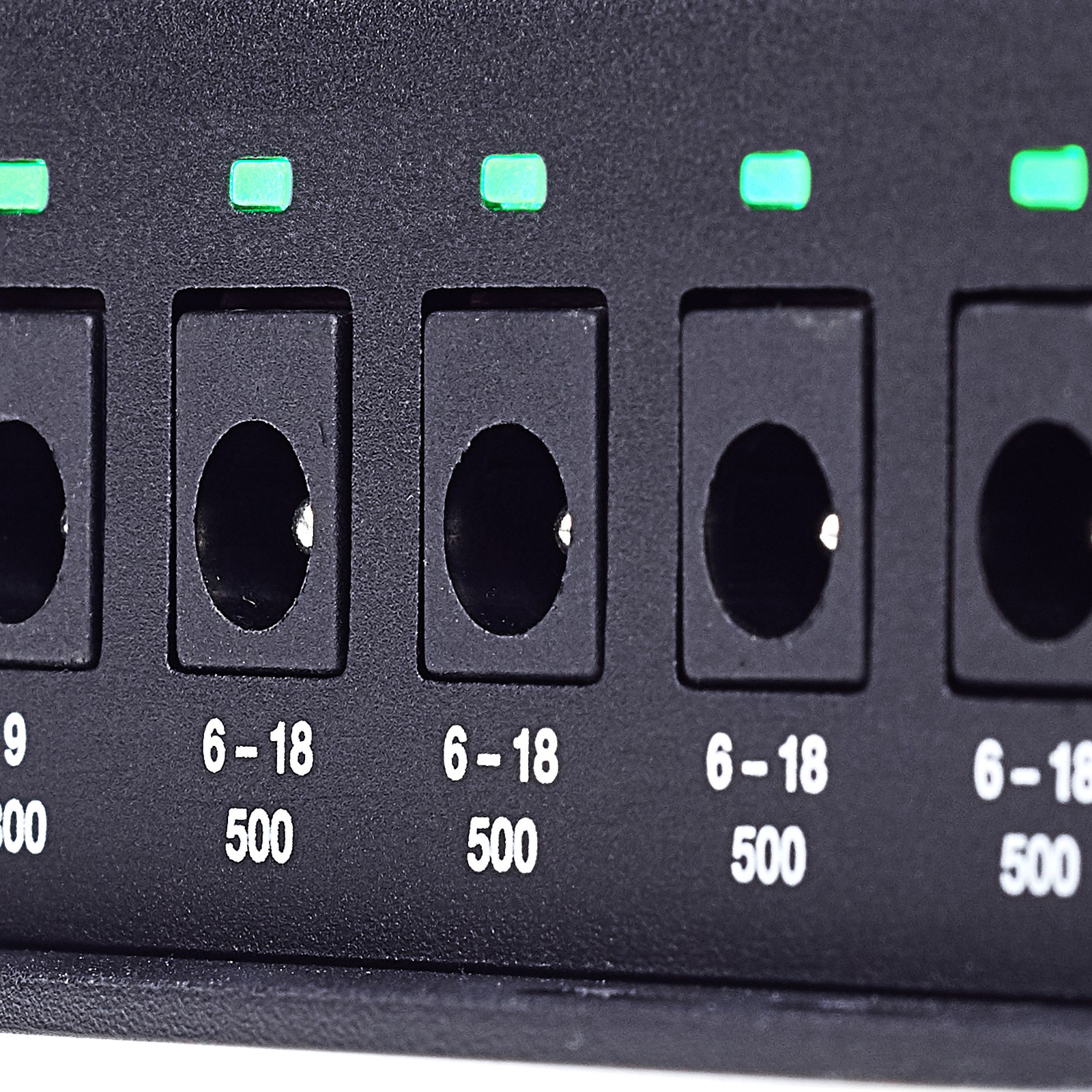 - Anschlüsse: Ausgang 1-8: 9 V DC @ 300 mA (einzeln isoliert) - Ausgang 9-12: 6-18 V DC @ 500 mA (einzeln isoliert)