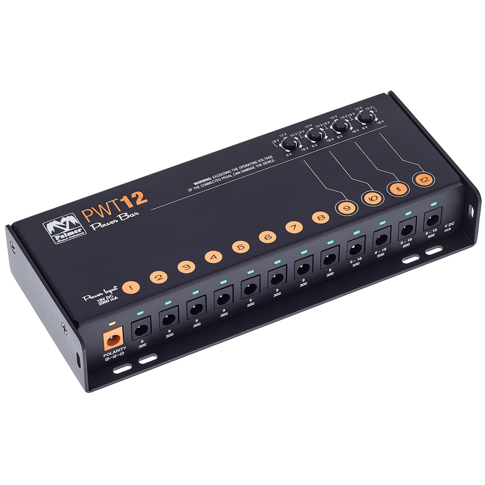 Das Palmer PWT 12 MK2 ist ein Mehrfachnetzteil, das speziell auf Effektpedale ausgerichtet ist und gleich 12 Gleichstromausgänge mitbringt. An jedem der separat, galvanisch getrennten und damit isolierten Spannungsausgänge liegen 9V an. Brummschleifen gehören damit der Vergangenheit an. Seine maximale Kapazität von 2.000mA macht das Gerät auch für aufwändigere Setups interessant. Das PWT 12 MK2 versorgt alle angeschlossenen Geräte konstant mit Spannung. Damit bringt es gegenüber dem Einsatz zahlreicher Batterien und Netzteile klare Vorteile. Dank Kurzschluss- und Überlastungsschutz gewährleistet es außerdem eine höhere Betriebssicherheit als verzweigte Lösungen mit etlichen Einzelnetzteilen. Ein passender Satz mit 12 DC-Kabeln gehört ebenso zum Lieferumfang wie das Netzadapter des Geräts selbst.