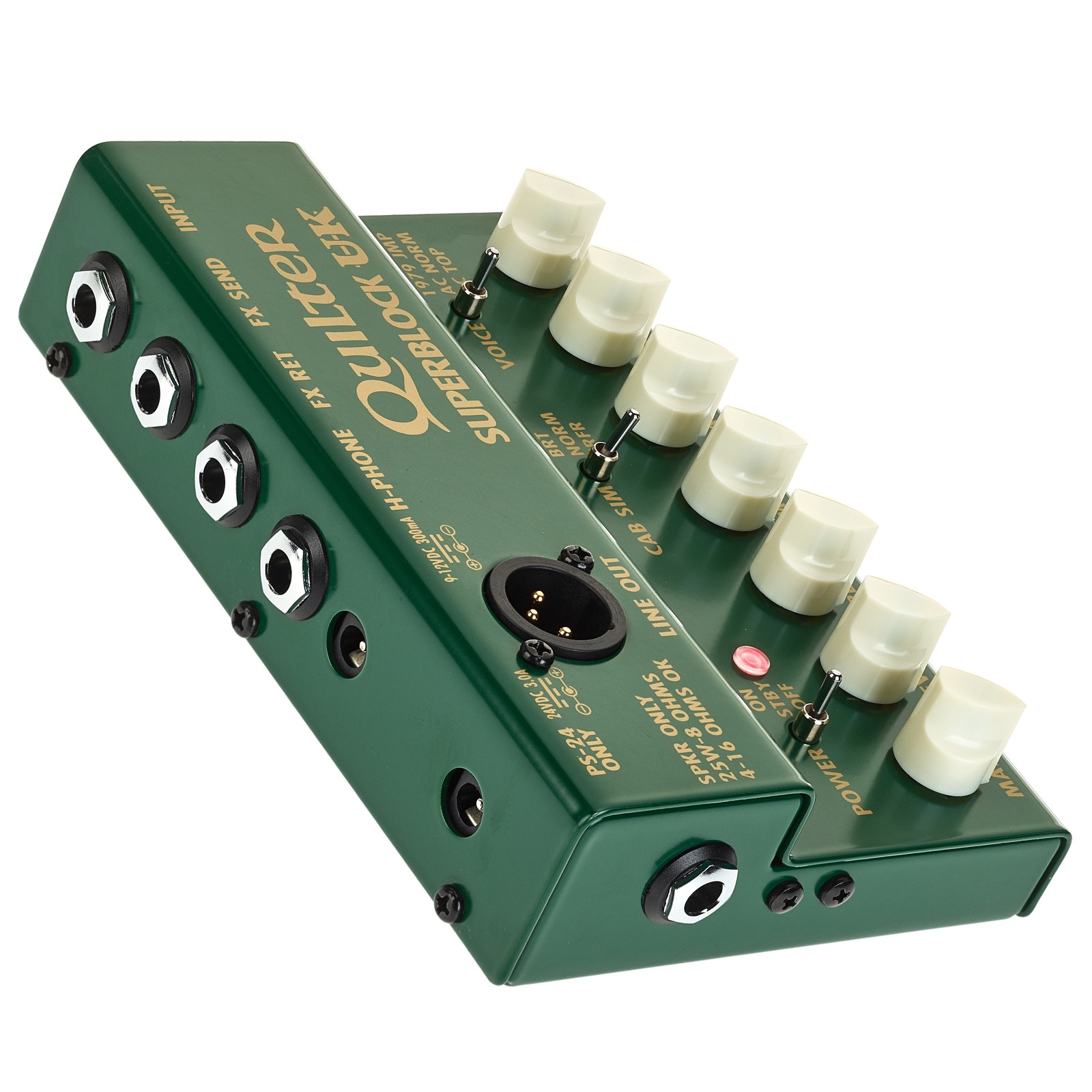 Der Quilter Superblock UK packt den Sound von gleich drei klassischen britischen Verstärkern in ein kompaktes Pedalformat und kann mit seiner integrierten 25W-Endstufe ohne Umwege mit einer Box der Wahl verbunden werden. Die drei Presets für die berühmten Sounds von Marshall und Vox können mit Gain und einer Dreiband-Klangregelung dem persönlichen Geschmack angepasst werden, während der Limiter für eine zusätzliche Verdichtung des Signals sorgt. Ein Hall-Effekt darf natürlich nicht fehlen und mit der dreistufigen Speaker-Simulation ist man auch im Studio beim Recording ohne Box bestens gerüstet. Anschlüsse für einen Kopfhörer sowie den FX-Loop komplettieren die Ausstattung des Superblock UK, der dank seines robusten Stahlblechgehäuses den rauen Alltag zwischen Proberaum und Bühne mühelos meistern kann.