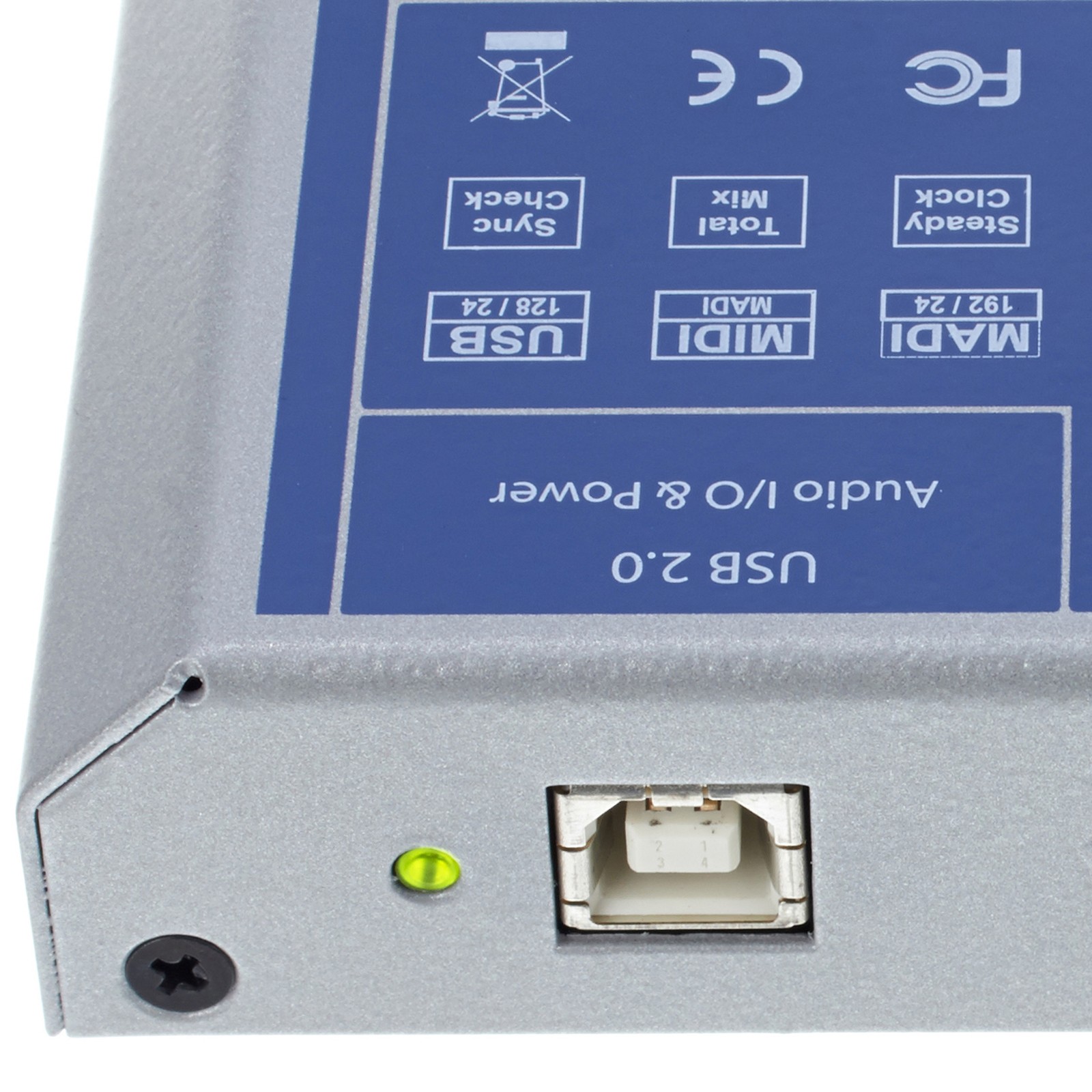 Auf der Rückseite des Madiface USB befindet sich ein USB-2.0-Anschluss, über den man es mit einem Computer oder Laptop verbindet. Die Mixing-Software TotalMix ermöglicht unabhängiges Routing sowie komplexe Mischungen aller Kanäle. Mit der dafür vorgesehenen Sektion „Control Room“ kann man das komplette Routing überwachen und Einstellungen zum Monitoring vornehmen. Wird eine Samplerate von 48kHz gewählt, stehen 64 Kanäle für die Aufnahme und 64 Kanäle zur Wiedergabe bereit – Ausgänge und Eingänge arbeiten dabei getrennt voneinander. Alle mit TotalMix veränderten Signale werden an beide Ausgänge des Madiface USB geleitet. Die Software erzeugt daneben unter anderem einen unabhängigen Mix-Ausgang und schleift die zweite Quelle seriell durch.