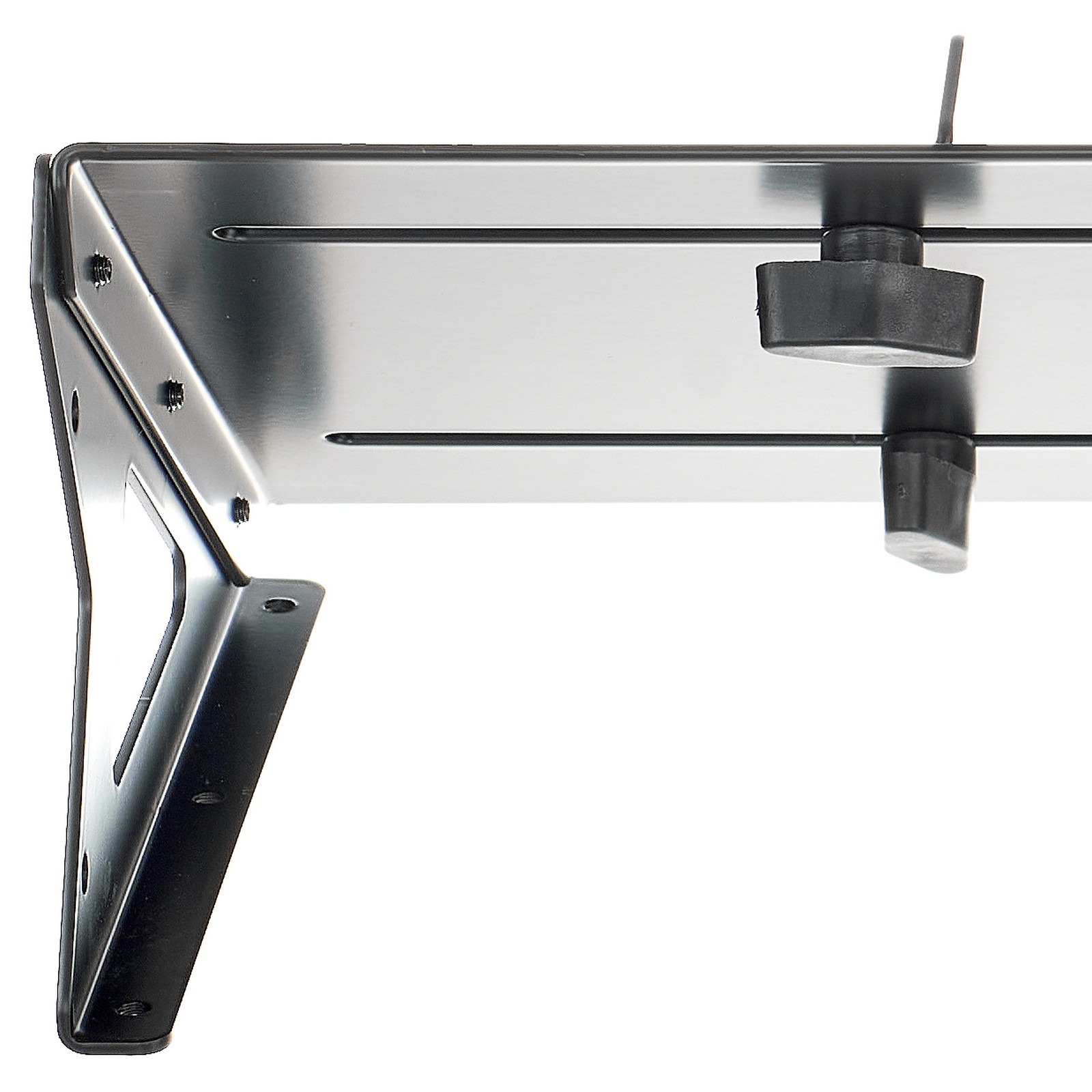 Die beiden schwarzen Trenner lassen sich individuell verschieben. Sie können über jeweils zwei Schrauben auf der Rückseite befestigt werden, sodass diese nicht verrutschen. Wenn eine größere Hardware auf dem Ständer platziert werden soll – wie zum Beispiel ein Modularsynthesizer in Desktop-Ausführung – lassen sich alle Trenner abnehmen. Auch der orangefarbene Mittelsteg lässt sich entfernen. Der Ständer besteht aus einem Hauptteil aus Metall mit einer Leiste, die für ein sicheres Auflegen der Hardware auf den Ständer sorgt. Dieses Hauptteil steht auf jeweils zwei Dreiecks-Elementen, die an den Seiten angebracht sind und den Ständer anwinkeln. Diese Elemente sind mit drei Schrauben am Ständer befestigt.