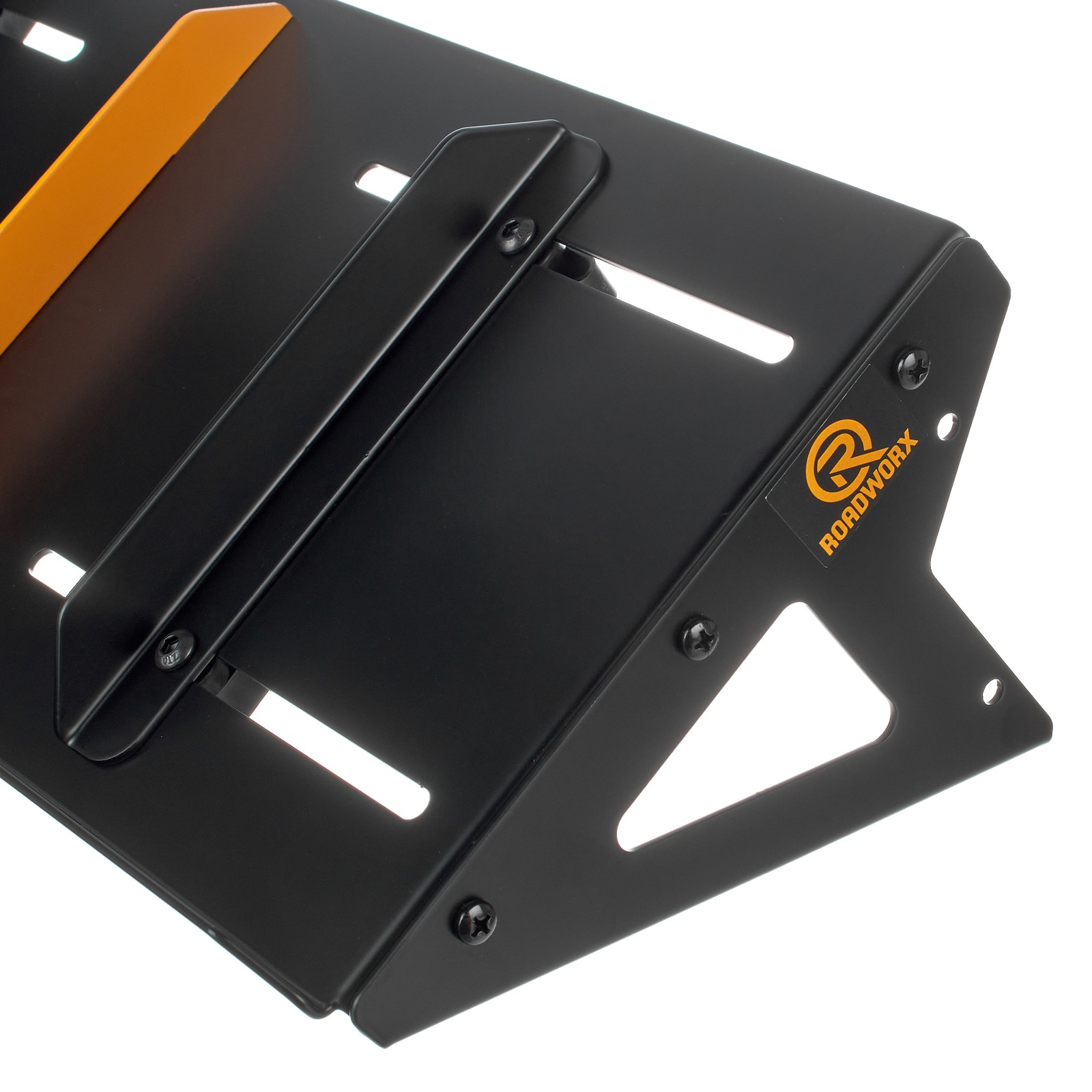 Der Roadworx Synthesizer Stand eignet sich für alle Freunde der elektronischen Musik, die für ihr Heimstudio eine komfortable und feste Ablagemöglichkeit für ihre Hardware suchen. Das Design ist komplett in Schwarz gehalten, sodass sich dieses nicht von der Studioumgebung absetzt. Der orangefarbene Mittelsteg markiert visuell eine Trennung zwischen zwei Ablageflächen. Mit einer Länge von insgesamt 48,5 cm und einer Breite von 19,8 cm finden Drumcomputer, Minisampler und viele andere Kompaktgeräte ihren Platz auf dem Ständer. Mit dem optional erhältlichen Erweiterungswinkel lassen sich zwei Ständer stabil miteinander kombinieren, damit noch mehr Hardware auf ihnen platziert werden kann. Diese werden an den beiden Dreiecken über zwei Schrauben befestigt. Ein Ständer hat jeweils ein Gewicht von 2,4 kg.