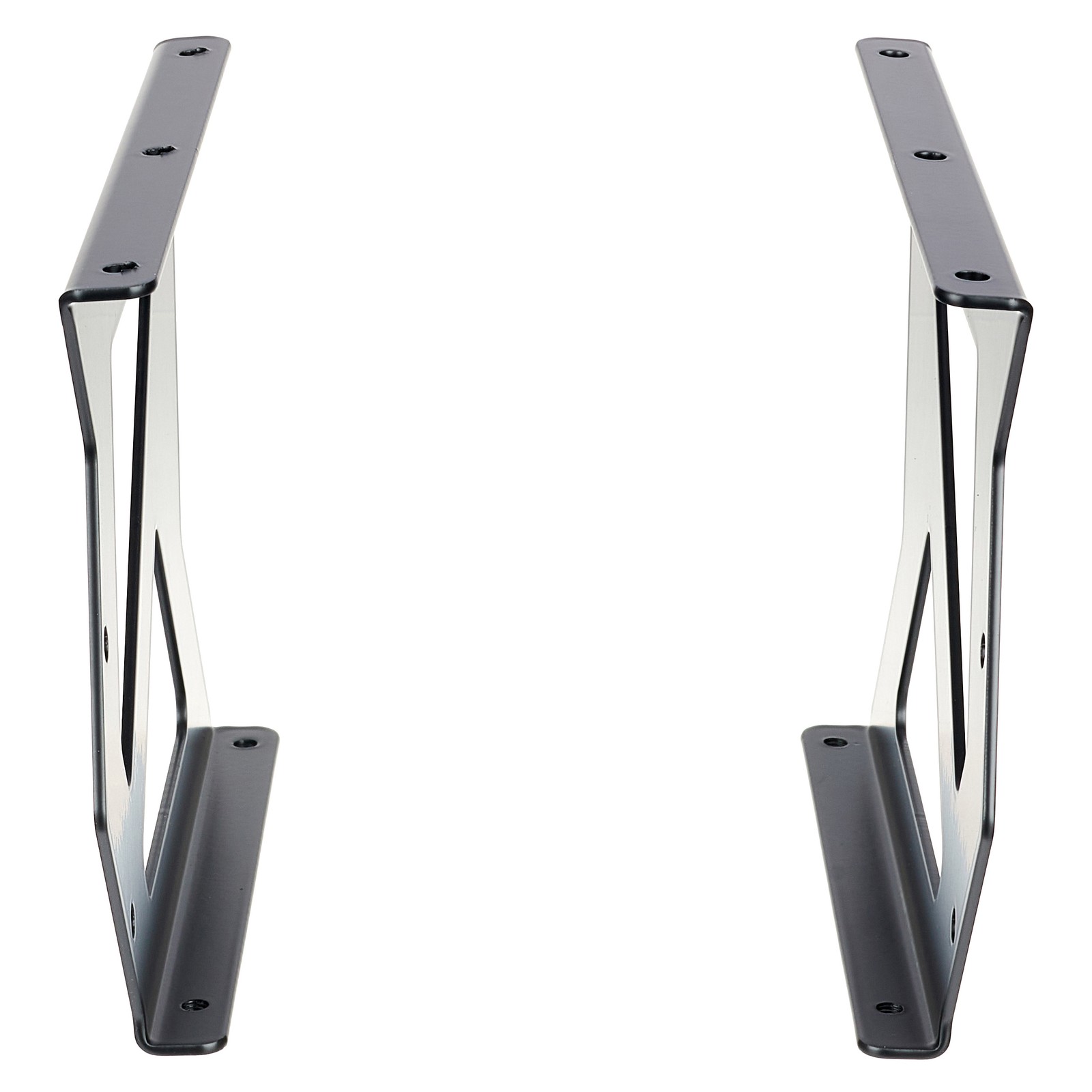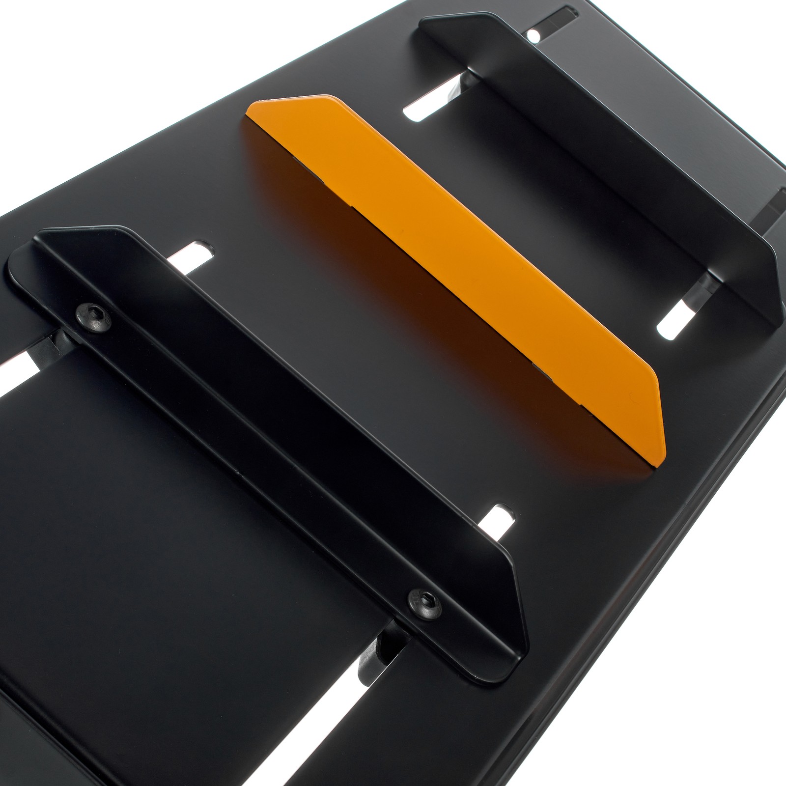 Der Roadworx Synthesizer Stand eignet sich für alle Freunde der elektronischen Musik, die für ihr Heimstudio eine komfortable und feste Ablagemöglichkeit für ihre Hardware suchen. Das Design des 48,5 cm langen und 19,8 cm breiten Ständers ist komplett in Schwarz gehalten, sodass es sich leicht in die Studioumgebung integriert. Der orangefarbene Mittelsteg markiert visuell eine Trennung zwischen zwei Ablageflächen. Mit dem beiliegenden Erweiterungswinkel lassen sich die beiden Ständer stabil miteinander kombinieren, damit noch mehr Hardware auf ihnen platziert werden kann. Die Winkel werden an den beiden Dreiecken über zwei Schrauben befestigt. Ein Ständer hat jeweils ein Gewicht von 2,4kg, kombiniert weisen beide Ständer ein Gewicht von 5,4kg auf.
