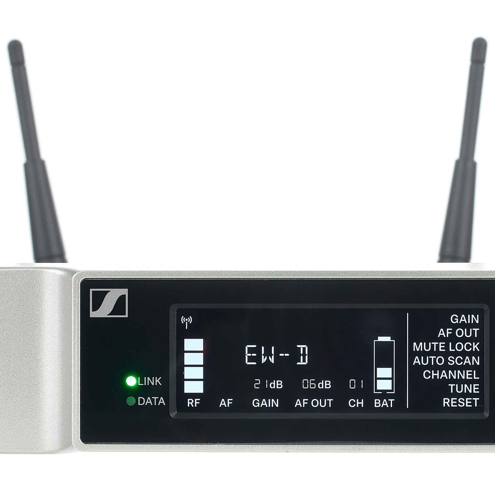 Mit einem phänomenal großen Dynamikumfang von ganzen 134dB überträgt die rauschfreie, digitale ew-D-Serie im UHF-Bereich selbst Sänger, die druckvoller performen als beim Soundcheck sowie sehr dynamische akustische Ereignisse bis ins kleinste Klangdetail transparent. Und sie hat eine hervorragend niedrige Latenz, die sich hören lassen kann. Multipliziert man dieses Erlebnis mit 90, erhält man nicht nur eine Vorstellung von der Anzahl der maximal zeitgleich nutzbaren Kanäle. Vielmehr ahnt man, welchen Eindruck Bühnenperformances mit diesen Sendesystemen erschaffen können. Im Set ew-D SK Base Q1-6 enthalten ist ein Taschensender, Stummelantennen, ein Netzteil mit Länderadapter, ein Rackmount-Set und ein Starterpaket Batterien. Ebenso ist eine Steuerungs-App sowie optionales Zubehör verfügbar. Die Sendestrecke darf in Deutschland genehmigungsfrei genutzt werden.