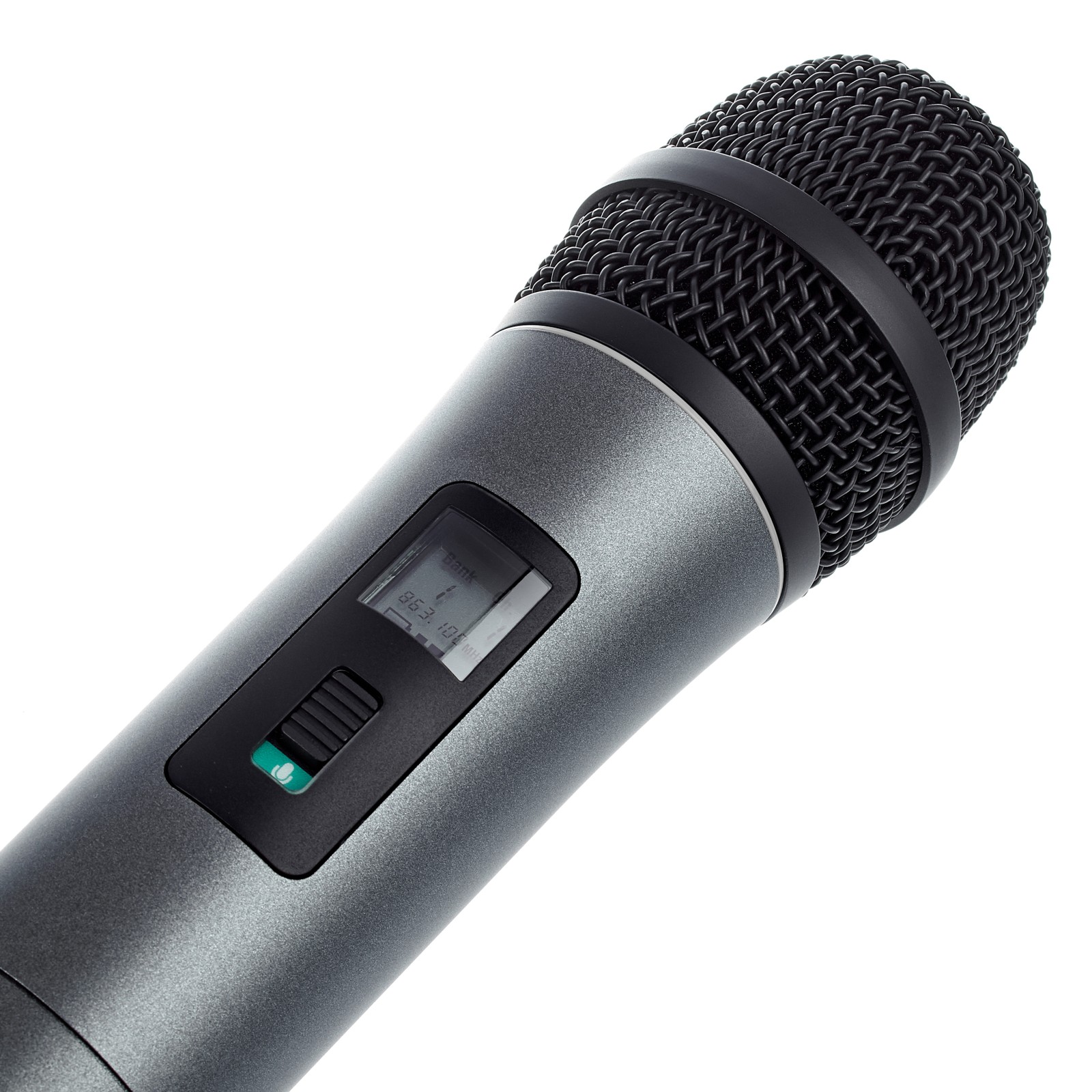 Das Sennheiser XSW 1-825 B-Band Vocal Set besteht aus einem kabellosen Mikrofon samt dazu gehörendem Empfänger. Gefunkt wird im Bereich zwischen 614 und 638 MHz, der ohne weitere Genehmigung gleich nach dem Auspacken frei nutzbar ist. Der fest eingestellte Pilotton sorgt für störungsfreien Betrieb, auch wenn der Handsender mal ausgeschaltet ist. Zudem sollten Sender und Empfänger mindestens fünf Meter Abstand voneinander haben. Die Sendeleistung liegt bei 10 mW. Mit jeweils nur einem Knopfdruck sucht der Empfänger eine freie Funkfrequenz, die man im zweiten Schritt auf den Handsender überträgt. Das System bringt den Frequenzbereich von 50 Hz bis 16 kHz zu Ohren. Mit zwei AA-Batterien hält ein Handsender locker eine zehnstündige Veranstaltung durch. Während kurzer Pausen Backstage kann der Künstler die Funkstrecke am Mikrofon stumm schalten. Mit einem Blick auf das Display von Handsender oder Empfänger wird er jederzeit über die Batterielaufzeit informiert.