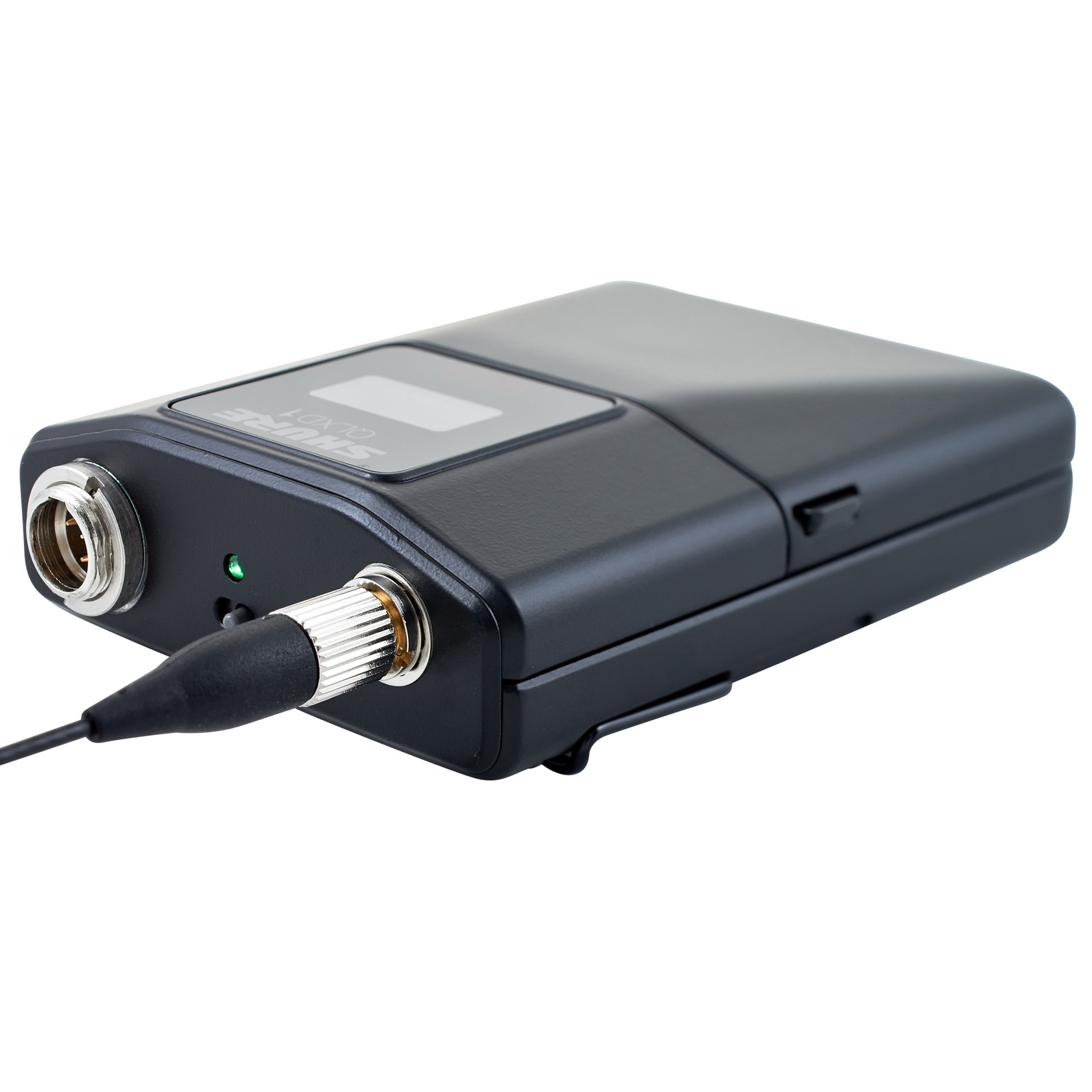 Der Taschensender QLXD1 H51 ist in ein tourtaugliches Gehäuse aus Aluminiumdruckguss eingebaut. Er hat einen Audioeingang mit TA4M-Mini-XLR-Buchse, mit der das passende Shure-Mikrofon- oder Instrumentenkabel sicher verschraubt wird. Die Audioübertragung gestattet einen Dynamikumfang von 120 dB in einem Übertragungsbereich von 20 bis 20000 Hz. 182 Sendestrecken können gleichzeitig in diesem Frequenzband bedient werden. Bis zu 22 Kanäle sind in einem 8 MHz-TV-Band miteinander kompatibel. Zur Konfiguration startet man am Empfänger den automatischen Frequenz-Scan und synchronisiert den Sender über die Infrarotschnittstelle. Auch weitere HF- und Audio-Parameter werden so übertragen. Die Batterieanzeige ist mit fünf Balken vergleichsweise detailliert. Wer den Li-Ionen-Akku nutzt, erhält sogar die verbleibende Nutzungsdauer besonders exakt in Stunden und Minuten angezeigt.