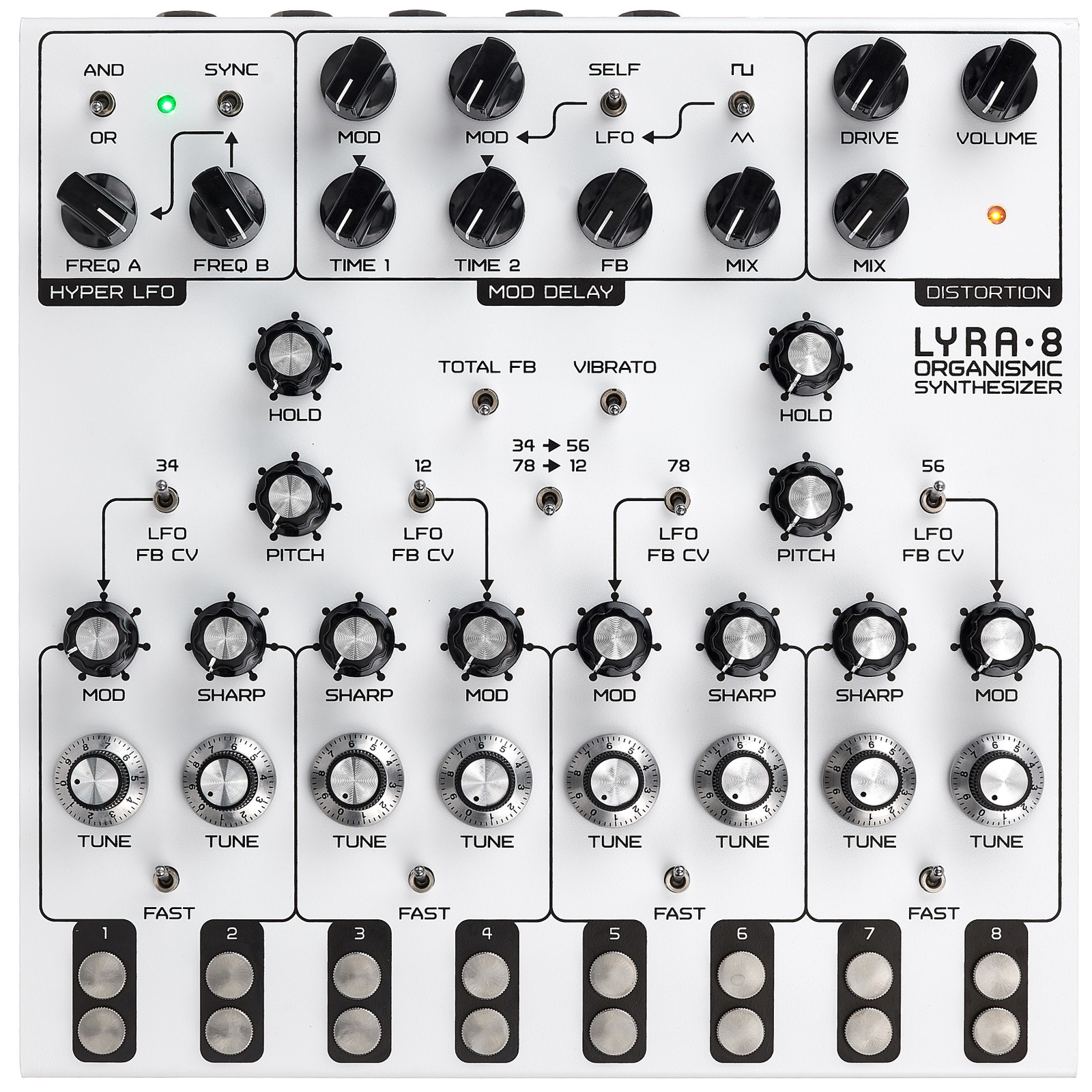 Die acht Stimmen sind in mehreren Gruppen angeordnet. Mit Sharp lässt sich die Wellenform von je zwei Stimmen verändern, mit MOD die Modulation. Die beiden Regler mit der Bezeichnung PITCH erzeugen eine grobe Stimmung, während die beiden HOLD-Regler zum Halten von Noten dienen – einer der beiden Regler kontrolliert jeweils eine Gruppe. Es können Akkorde gespielt werden, bei denen jede Stimme eine eigene Tonhöhe besitzt. Für die Stimmung jedes einzelnen Oszillators mit TUNE bedarf es etwas an Feingefühl, denn jeder Drehregler muss manuell eingestellt werden. Die beiden Oszillatoren links bieten fette Grundtöne, die in der Mitte decken den mittleren Frequenzbereich ab und die beiden rechts bieten sehr hohe Töne. Aktiviert man bei der Hüllkurve die Funktion FAST, so hat man eine lange Decay-Rate. Dies wirkt sich auch auf den Regler HOLD aus, mit dem dann alle vier Stimmen gleichzeitig erklingen können, sofern er sich in der Mittelstellung befindet. Mit den beiden Schaltern mit der Bezeichnung LFO FB CV in der Mitte des Synthesizers kann die Cross-Modulation aktiviert und zwischen zwei verschiedenen Modi gewählt werden. Die Zahlen über den Schaltern geben an, welche Stimmen die Modulation dieser Gruppe beeinflussen.