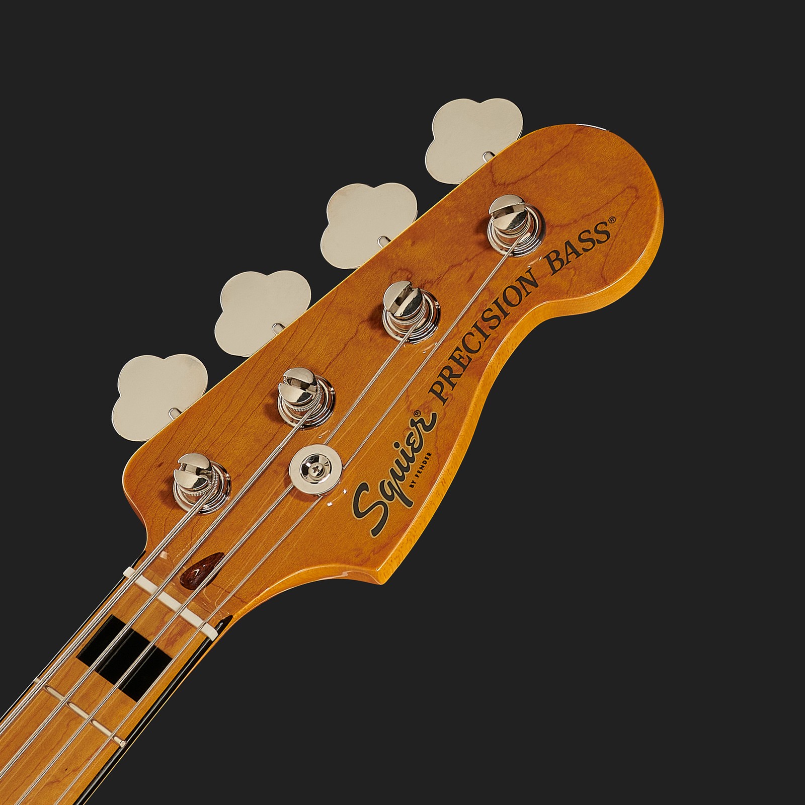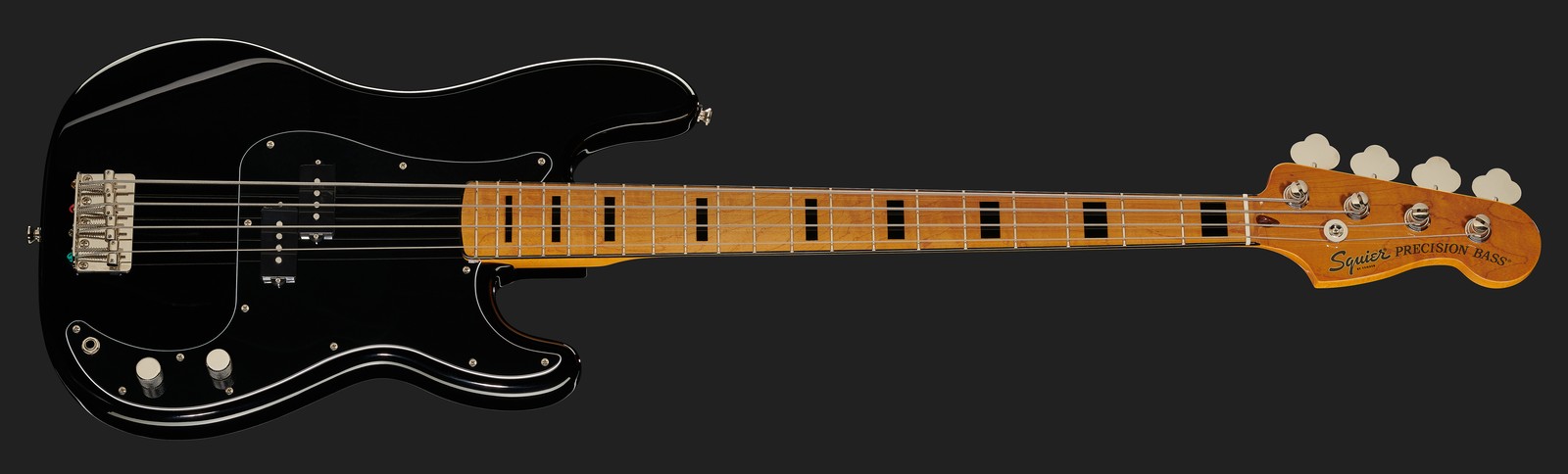 Den Precision Bass kann man getrost als Klassiker bezeichnen, denn seit 1957 wird dieser Viersaiter ohne große Veränderungen gebaut. Warum? Weil er einfach gut ist! Der charaktervolle Ton des Precision besitzt ordentlich Punch und Low End und ist von Motown bis Heavy Metal in vielen Stilistiken zuhause. Sein Split Coil Tonabnehmer und die passive Elektronik verzichten auf überflüssige Features und verrichten einfach ihren Dienst, wenn es darauf ankommt. Das Original stammt natürlich von der Firma Fender, diese bietet aber unter dem Namen Squier eine preiswerte Serie an, die es auch Bassisten/innen mit schmalerem Budget ermöglicht, diesen Klassiker zu besitzen. Einer davon ist der Squier Classic Vibe 70s, der sich klanglich und vor allem optisch mit dem hellem Ahorngriffbrett und den schwarzen Blockinlays an die Precision-Bässe der 70er Jahre anlehnt.