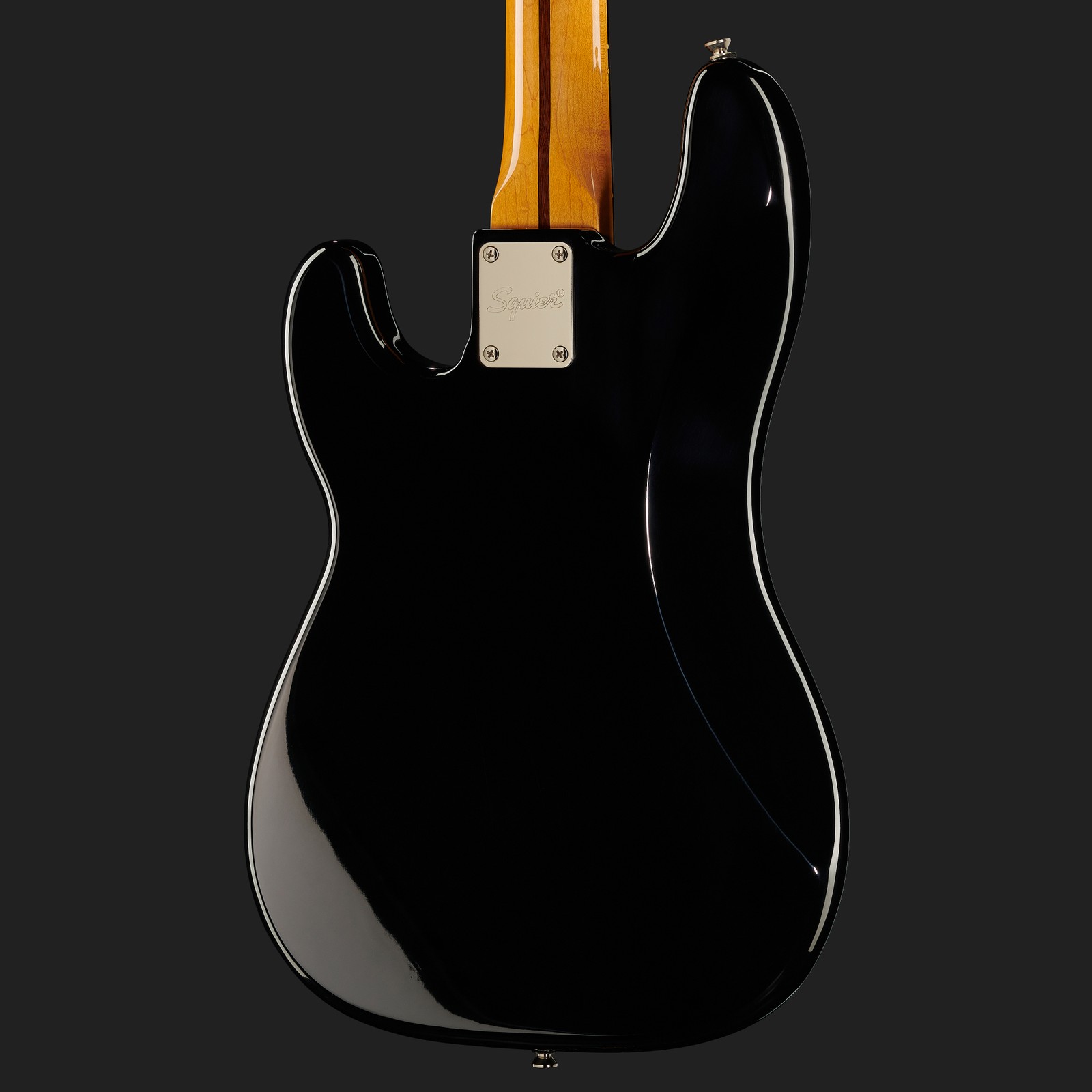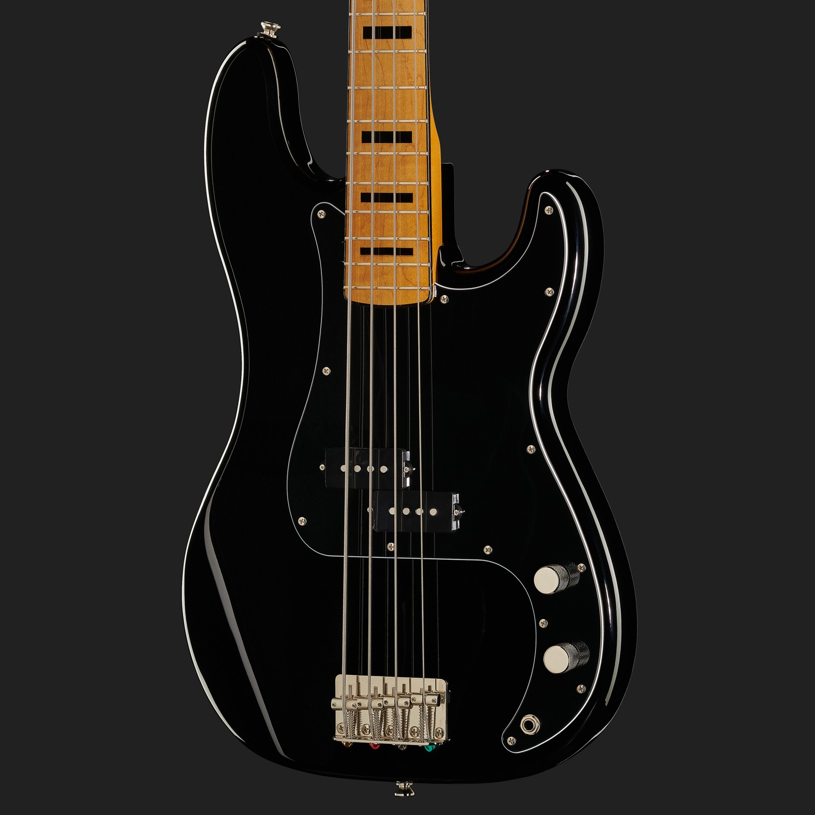 Das Fundament jedes Instruments sind seine Hölzer, beim Squier Classic Vibe 70s sind dies Nato für den Korpus sowie Ahorn für den Hals und das Griffbrett, welches 20 Bünde beheimatet. Den prägnanten Precision-Sound liefert der Split Coil Tonabnehmer, der etwa in der Mitte zwischen Brücke und Hals positioniert ist. Die passive Elektronik mit einem Volumeregler und einer Tonblende ermöglicht aggressive Rocksounds genauso wie einen smoothen Vintage-Ton. Die Nickelhardware beinhaltet Vintage Style Stimmmechaniken und eine Brücke mit vier einzelnen Saitenreitern. Ein besonderes Highlight des Squier Classic Vibe 70s sind die schwarzen Blockinlays und das schwarze Binding, die beide zusammen einen schönen Kontrast zum hellen Ahorngriffbrett bilden. Dieses wurde, wie auch der Hals, der übrigens ein rundliches C-Profil besitzt, mit einem schönen Vintage Teint behandelt. Das schwarze Finish ist zeitlos und passt optisch in jede Stilistik.