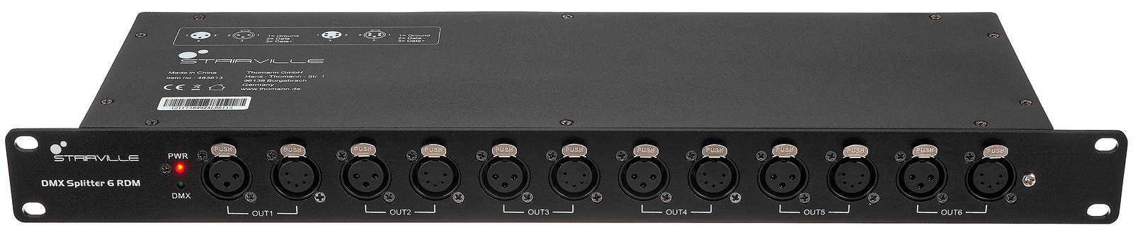 In Clubs oder Locations mit mehreren Veranstaltungsräumen spart der Stairville DMX Splitter 6 RDM eine Menge Aufbauzeit und Kosten. Unabhängig davon, ob die Räume alternativ oder zeitgleich bespielt werden, genügt ein Lichtpult mit diesem Splitter, der im Rack nur eine Höheneinheit braucht, um mehrere DMX-Ketten anzusprechen. Dazu können alle Anschlüsse dauerhaft mit dem Splitter verbunden bleiben. Soll das Lichtrack mit Pult und Splitter im jeweiligen Varanstaltungsraum aufgestellt werden, bleibt die Steuerung ebenfalls verkabelt. Man schließt nur noch das DMX-Kabel des genutzten Saals an einen der Ausgänge an.
