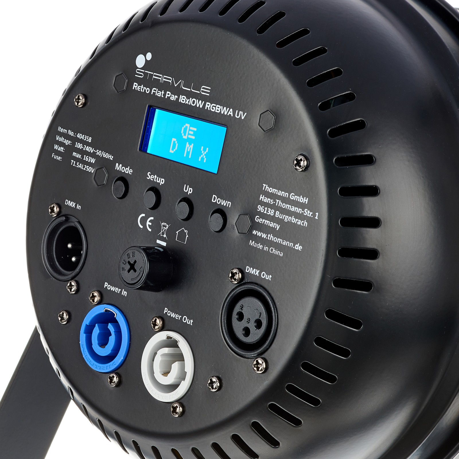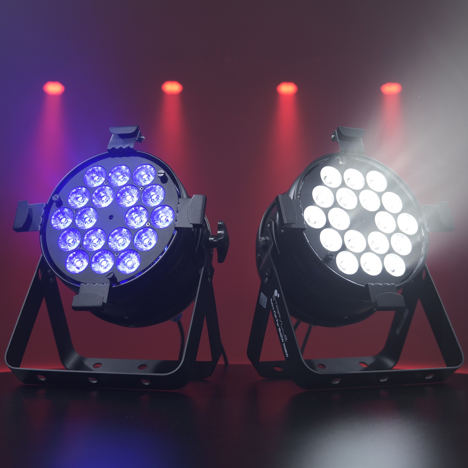 Im robusten Metallgehäuse sorgen nicht weniger als 18 leistungsstarke 10 Watt RGBWA UV-LEDs für Strahlkraft in allen mischbaren Farben. Bedient wird der Par per DMX-Steuerung, mit Menütasten am Display oder mit einer optional erhältlichen Fernbedienung. Diese benötigt Sichtkontakt zum mittig zwischen den Linsen montierten Infrarot-Empfänger. Wer sich für die die DMX-Steuerung entscheidet, kann zwischen dem 6-, 8- oder 10-Kanal-Modus wählen. 14 Automatikprogramme sind bereits vorinstalliert, eine Musiksteuerung sowie ein Master-Slave-Modus sind vorhanden. Der Scheinwerfer hat einen Abstrahlwinkel von 25°, während eine optional erhältliche Wechsellinse breite 40° ermöglicht. Der eingebaute Lüfter arbeitet temperaturgesteuert. Der Stromverbrauch liegt bei 160 Watt.