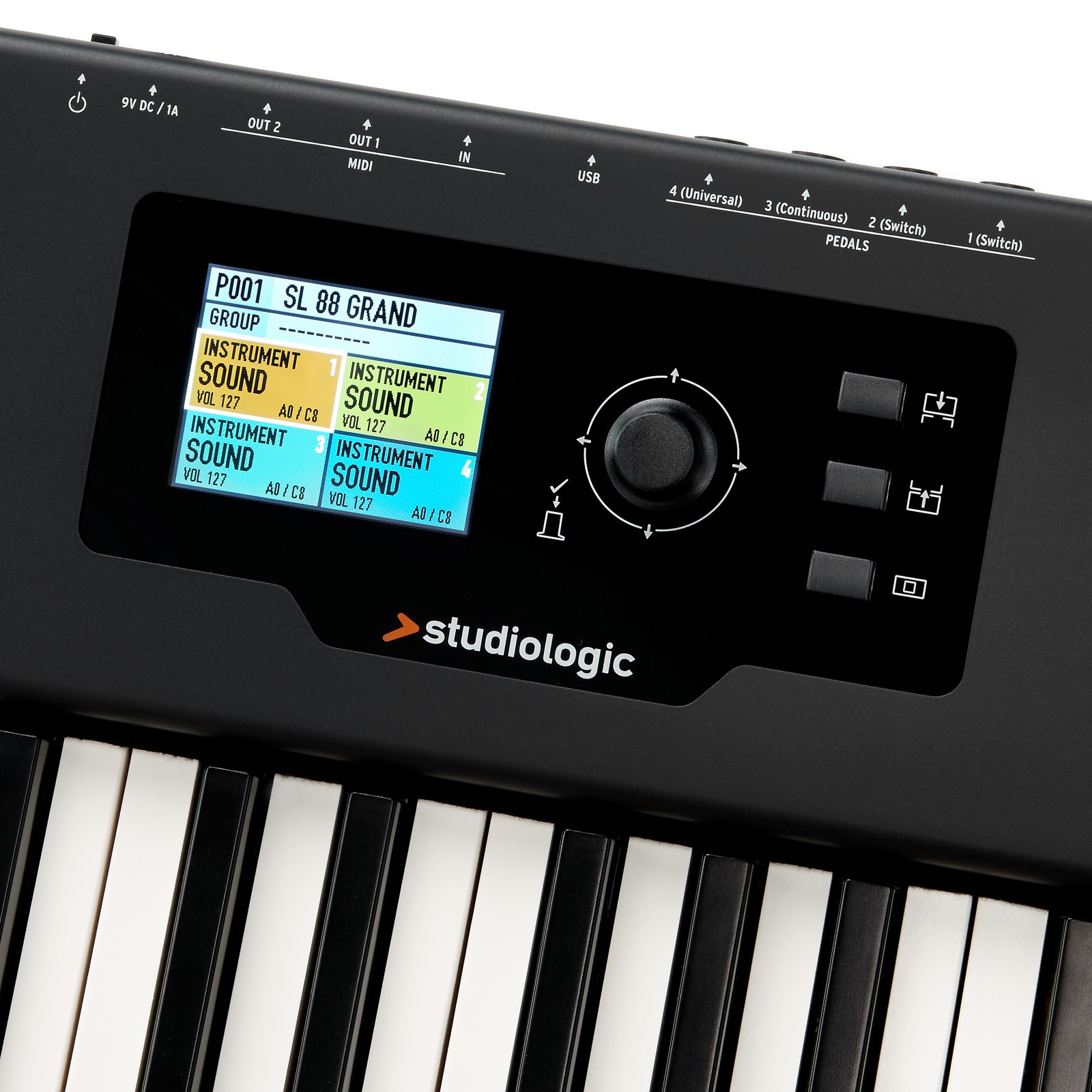 B-Stock, Studiologic SL88 Grand, Masterkeyboard, 88 Tasten, gewichtete Hammermechanik TP40Wood mit Aftertouch, Tasten mit Holzkern und Ivory Touch Tastenoberfläche, Neue 6 Wege Joystick-Bedienung, 3 Drucktaster, 4 programmierbare Zonen, 4 programmierbare Pedalanschlüsse, 3 Joystick Controller, TFT Farbdisplay (320x240), Editierbare und programmierbare Software, Neue programmierbare Key-Balance Funktion, 6 editierbare Velocity Kurven, Magnetschienensystem für Noten- und Laptophalterung (Halterungen nicht im Lieferumfang enthalten), inkl. Netzteil: 9V DC 1A, VFP1/10 Sustainpedal und Sammlung virtueller Instrumente nach Registrierung der Hardware; Abmaße (LBH): 1260 x 310 x 110 mm, Gewicht: 20,8 kg, Versandrückläufer mit voller Garantie, ggf. mit Gebrauchsspuren.
