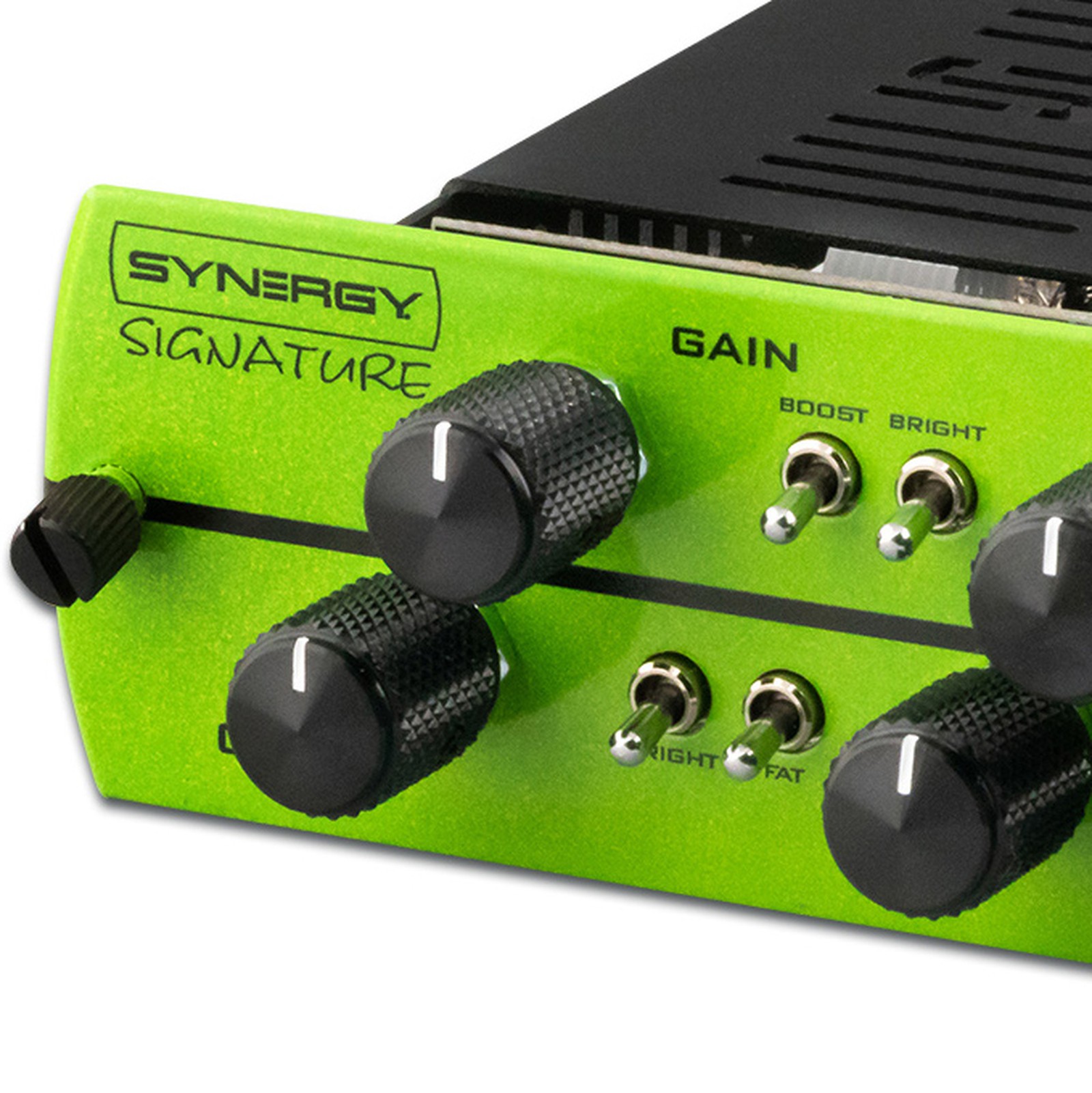 Hinter dem Herstellernamen Synergy steht der kalifornische Vertrieb Boutique Amps Distribution. Die Marke Synergy offeriert eine komplette Produktpalette von Vollröhrenverstärkern, Vorverstärkern und zugehörigen Boxen. Die Besonderheit dabei ist die modulare Ausführung der Vorstufe, die den Systemen eine hohe Klangflexibilität, Erweiterbarkeit und damit Zukunftssicherheit ermöglicht. Die zugehörigen Vorstufenmodule sind in zahlreichen Varianten verfügbar und entstehen oft in Zusammenarbeit mit namhaften Verstärkerbauern wie Friedman, Diezel, Engl, Soldano oder Fryette, deren Schaltungen in das Modulformat portiert wurden. So lässt sich der Klangcharakter des Verstärkers nach Belieben und entsprechend des jeweiligen Einsatzgebiets, live und im Studio, immer wieder neu definieren.