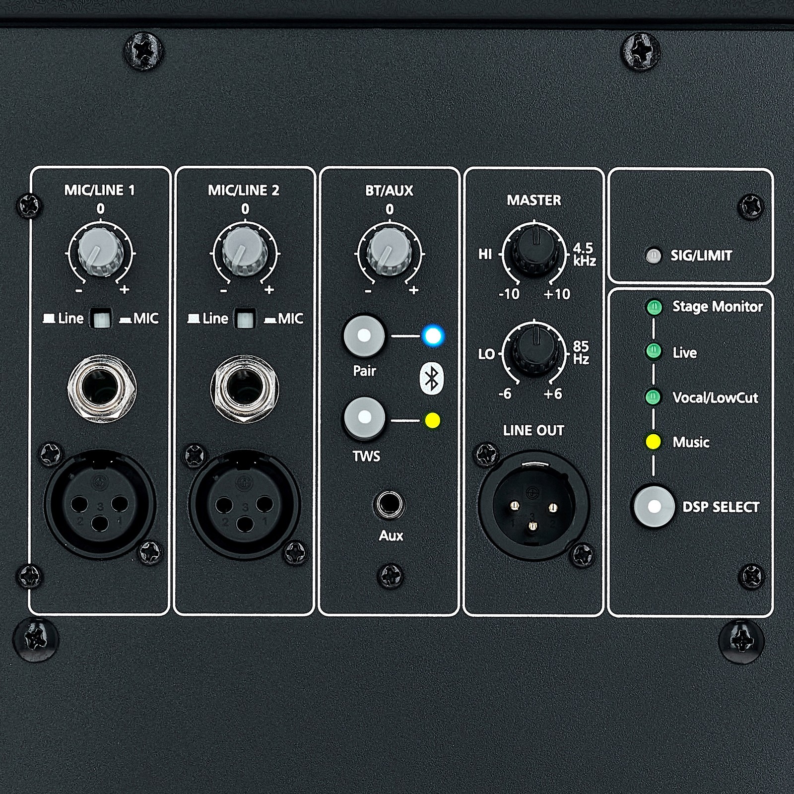Wenn Klang über Bluetooth wiedergegeben werden soll, muss zunächst am D112SP nach bluetooth-fähigen Kopplungsgeräten gesucht werden. Dies geschieht über das das Halten der Taste Pair für drei Sekunden. Mit der Funktion True Wireless Stereo können zwei Lautsprecher miteinander verbunden werden, um das Signal in Stereo wiederzugeben. Hierzu wird die dementsprechende Taste an jeder Lautsprecherbox für drei Sekunden gedrückt. Der Gesamtklang des D112SP lässt sich über die vier DSP-Soundprogramme für Musik, Sprache und der Verwendung für Beschallung und Monitoring optimieren. Die Option Vocal/Low Cut eignet sich für eine Verwendung mit einem Subwoofer. Hier wird ein Low-Cut bei 120Hz angesetzt. Bei Live handelt es sich um ein Fullrange-Preset mit deutlich mehr Obermitten und Höhen. Bei der Verwendung als Stage Monitor wird in diesem Preset der Bass um 4dB abgesenkt und weniger tiefere Mitten geboten.
