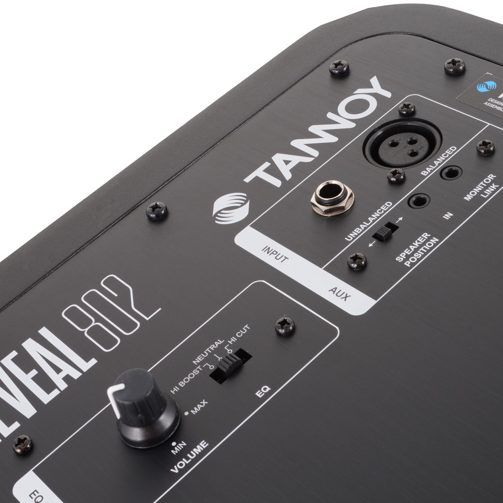 Der Tannoy Reveal 802 ist ein kompakter aktiver Nahfeldmonitor für Heim- und Projektstudios, der mit einem Zwei-Wege-System arbeitet. Ein 8"-Tieftöner und ein 1"-Hochtöner werden bei ihm mit einer Leistung von 100W RMS zum Schwingen gebracht und können einen maximalen Schalldruckpegel von 114dBSPL erreichen. Mit einem von 42 bis 43.000Hz reichenden Frequenzgang reicht er in den Bässen deutlich weiter hinab als kleinere Modelle dieser Serie. Seine Höhenwiedergabe ist gut aufgestellt und übersteigt den typischen menschlichen Hörbereich um mehr als das Doppelte. Deshalb sind diese Speaker für Einsteiger wie auch für fortgeschrittene Recording- und Mixing-Fans ein tolles, preiswertes Tool, das ihr Setup produktiver machen kann.