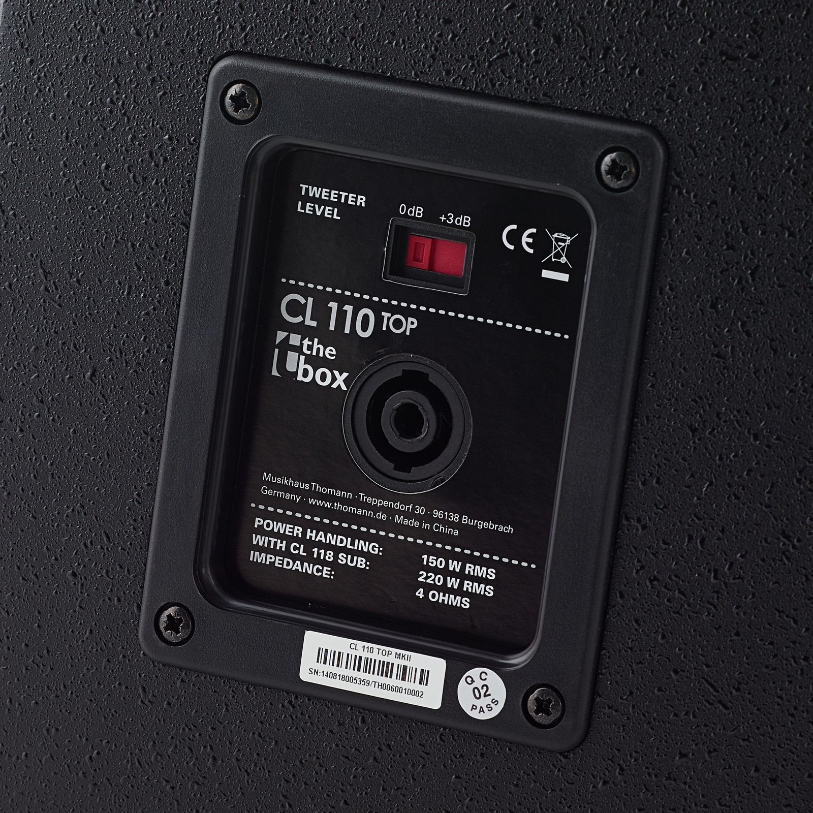 Das Endstufenmodul befindet sich auf der Rückseite der CL 118 und neben dem Kaltgeräteanschluss mit Netzschalter sind hier alle für den Einsatz benötigten Anschlussmöglichkeiten und Bedienelemente untergebracht. Zur Übertragung des Eingangssignals können sowohl zwei Klinke-XLR-Kombibuchsen als auch Cinch-Anschlüsse genutzt werden. Die Gesamtlautstärke kann mit Hilfe des Main-Level-Reglers eingestellt werden und zusätzlich lässt sich die Lautstärke des Subwoofers separat regeln. Ausgangsseitig stehen zwei verriegelbare Speaker-Twist-Einbaubuchsen zur Verfügung, mit denen das Signal an die beiden CL 110 weitergegeben werden kann. An deren Anschlussfeld befindet sich neben der Eingangsbuchse ein Schalter, mit dem der Pegel des Kompressionstreibers um 3 dB angehoben werden kann, womit bereits am Lautsprecher zwei unterschiedliche Klangcharaktere gewählt werden können.