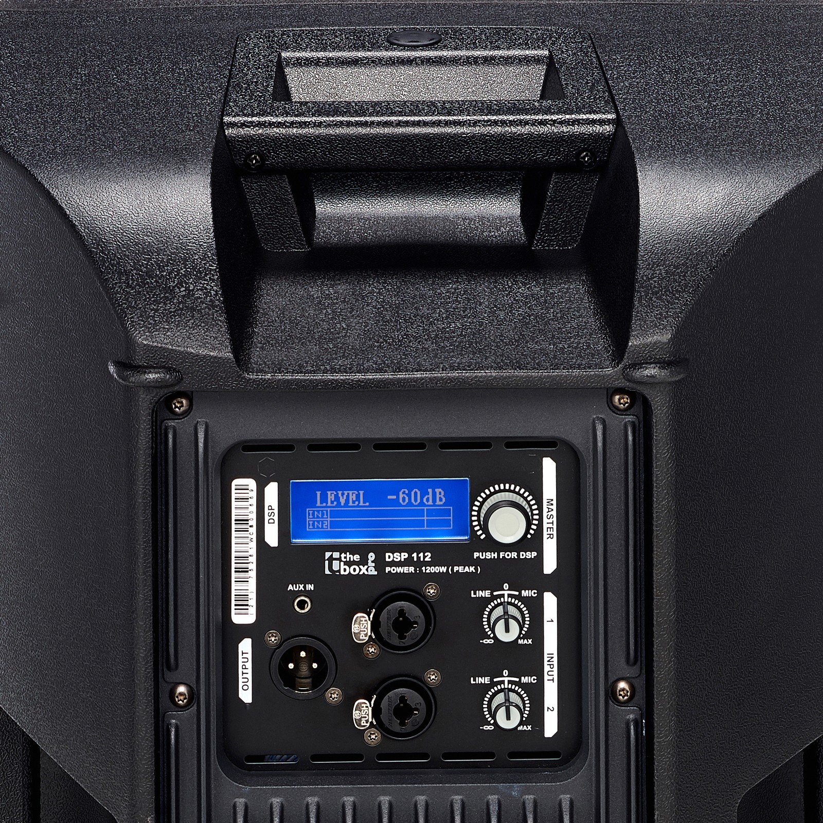 Der integrierte DSP des the box pro DSP 112 bietet vier verschiedene Soundprogramme (Musik, Live, Speech, DJ), die seinen Klang für unterschiedliche Anwendungen anpassen können. Außerdem steht ein 3-Band-EQ bereit, mit dessen Hilfe sich Bässe, Mitten und Höhen jeweils um bis zu 12dB anheben oder absenken lassen. Das grafische Display ermöglicht auf Knopfdruck auch die Überwachung seiner beiden Eingänge. Wer einen oder zwei the box pro DSP 112 im Zusammenspiel mit einem Subwoofer nutzen möchte, kann seine Basswiedergabe per LowCut-Filter begrenzen. Hier stehen die Grenzfrequenzen 80Hz, 100Hz, 120Hz und 150Hz zur Wahl. Dadurch ist der Lautsprecher mit vielen anderen bass-starken Speakern kompatibel. Um das Audiosignal vor Übersteuerung zu schützen ist außerdem ein DSP-Limiter mit an Bord.