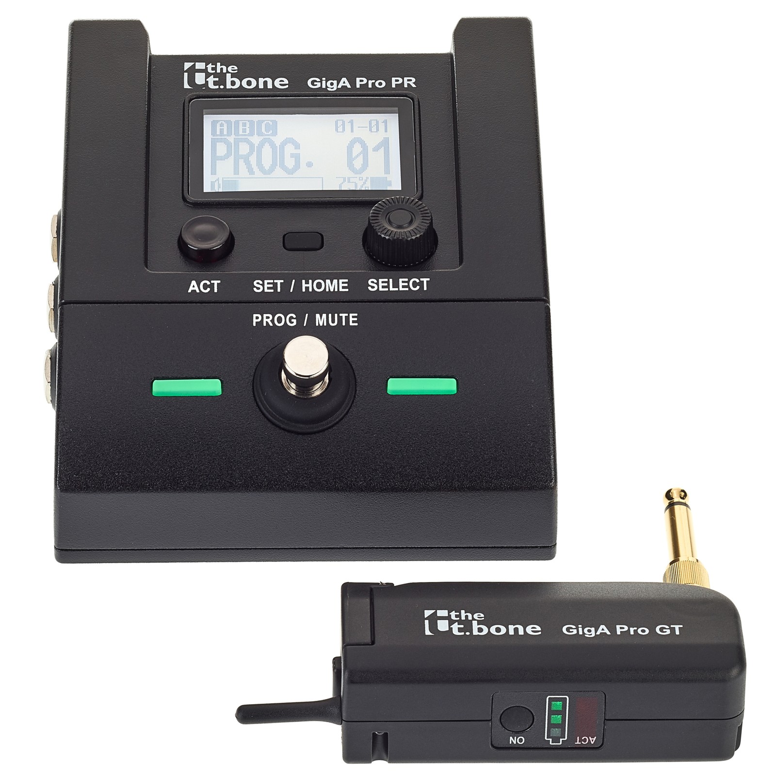 Das the t.bone GigA Pro Pedal Set ist ein digitales Funkset, bestehend aus Bodenpedal-Empfänger und Plug-On- beziehungsweise Clip-Sender. Dank der beiliegenden Akkuladestation zählt die Drahtlosanlage in ihrer Preisklasse zu den Wireless-Systemen mit einem der komplettesten Lieferumfang-Pakete. Da das Set im weltweit anmeldefrei nutzbaren Frequenzbereich um 2,4 GHz funkt, werden über den Kaufpreis hinaus keine Kosten für Gebühren fällig. Audiosignale werden für die Funkübertragung digital in 24 Bit / 44.1 kHz gewandelt. Das entspricht Studioqualität und geschieht hier mit einer unmerklich geringen Latenz von unter 4 Millisekunden. Die große 3-stellige Batterieanzeige am Clip-Sender ist ohne Mühe auch im Dunkeln gut ablesbar. Das OLED-Display am Pedal-Empfänger gibt Auskunft über die wichtigsten Parameter, wie beispielsweise das gewählte Funkkanal und den Akkustand des Taschensenders. Und weil ein Gitarren- und Bass-Kabel gleich beiliegt, ist das Set auch sofort einsatzbereit.