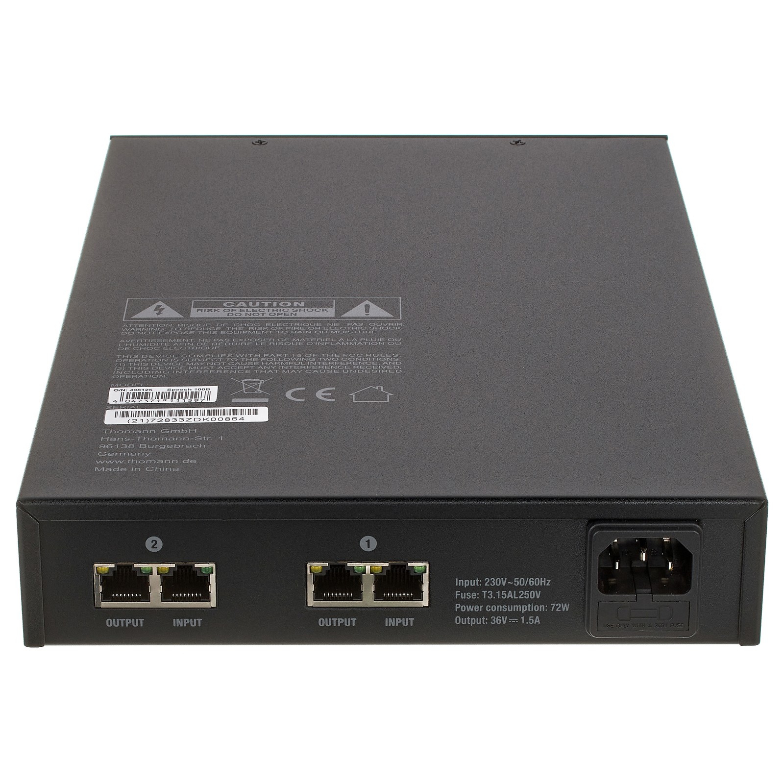 Über die Steuerzentrale des Konferenzsystems Speech 100 können bis zu 32 Sprechstellen mit Strom versorgt werden. Setzt man die hier angebotene Netzteilerweiterung the t.bone Speech 100 B ein, erhöht sich die Anzahl der möglichen Konferenzteilnehmer auf 64. Mit zwei Boostern kann das System sogar auf bis zu 72 Sprechstellen erweitert werden. Der Speech 100 B hat seine Anschlüsse auf der Geräterückseite. Die Leistungsaufnahme liegt bei 72 Watt. Ein Kaltgeräteeinbaustecker dient der Stromversorgung. Unterhalb der Netzbuchse ist eine träge 5 x 20 mm-Feinsicherung mit 3,15 A und 250V platziert. Ebenfalls auf der Rückseite dienen vier Buchsen dazu, die Netzwerkleitung in zwei Strängen in den Booster und wieder heraus zu führen. Der Speech 100 B misst 305 x 45 x 197 mm und wiegt 2,45 kg.