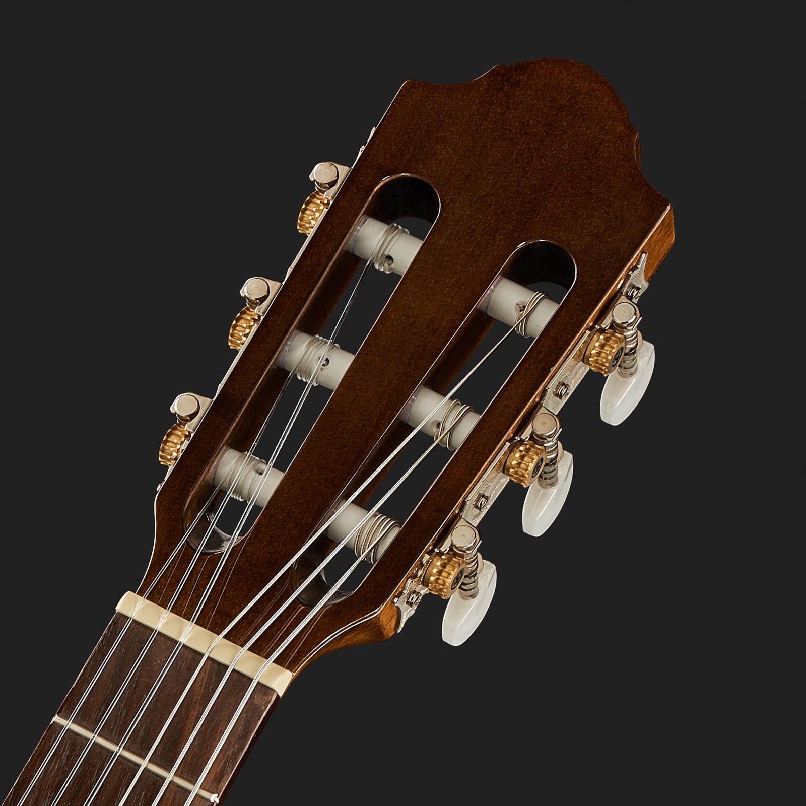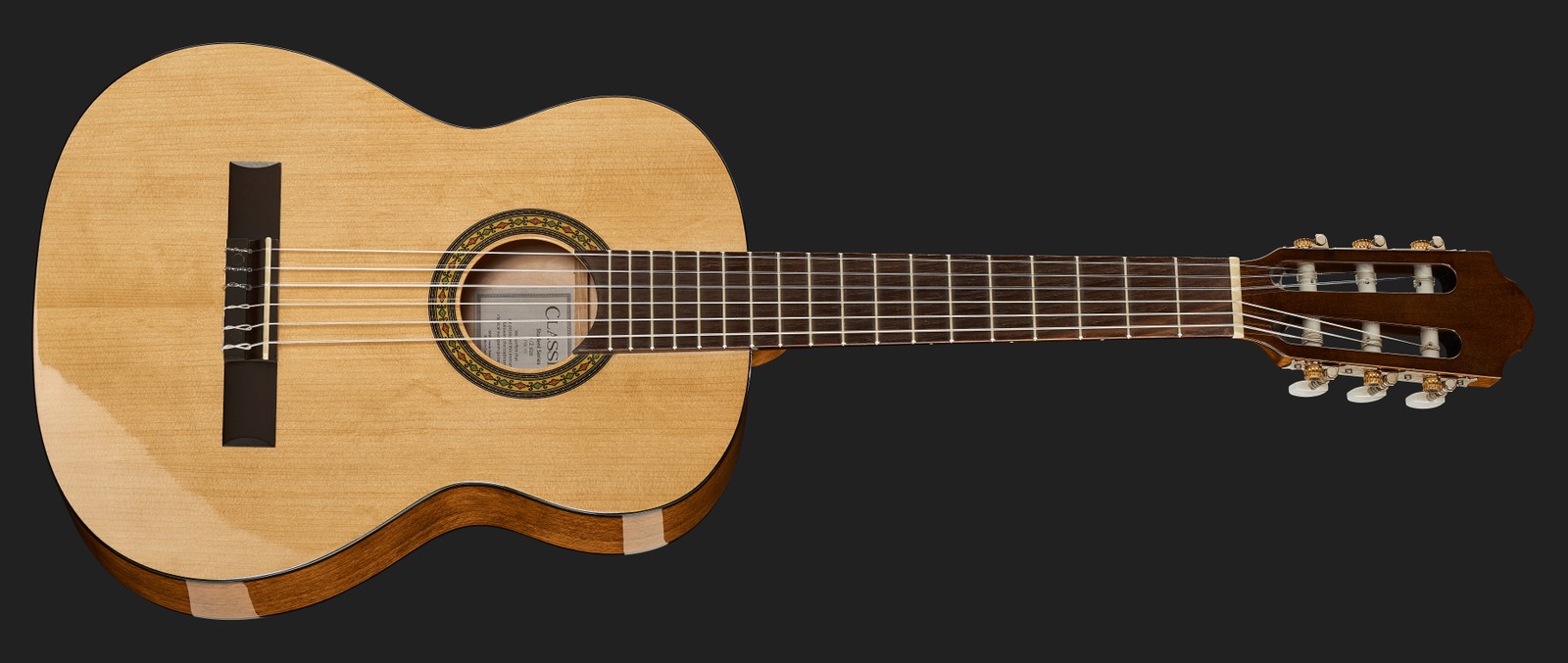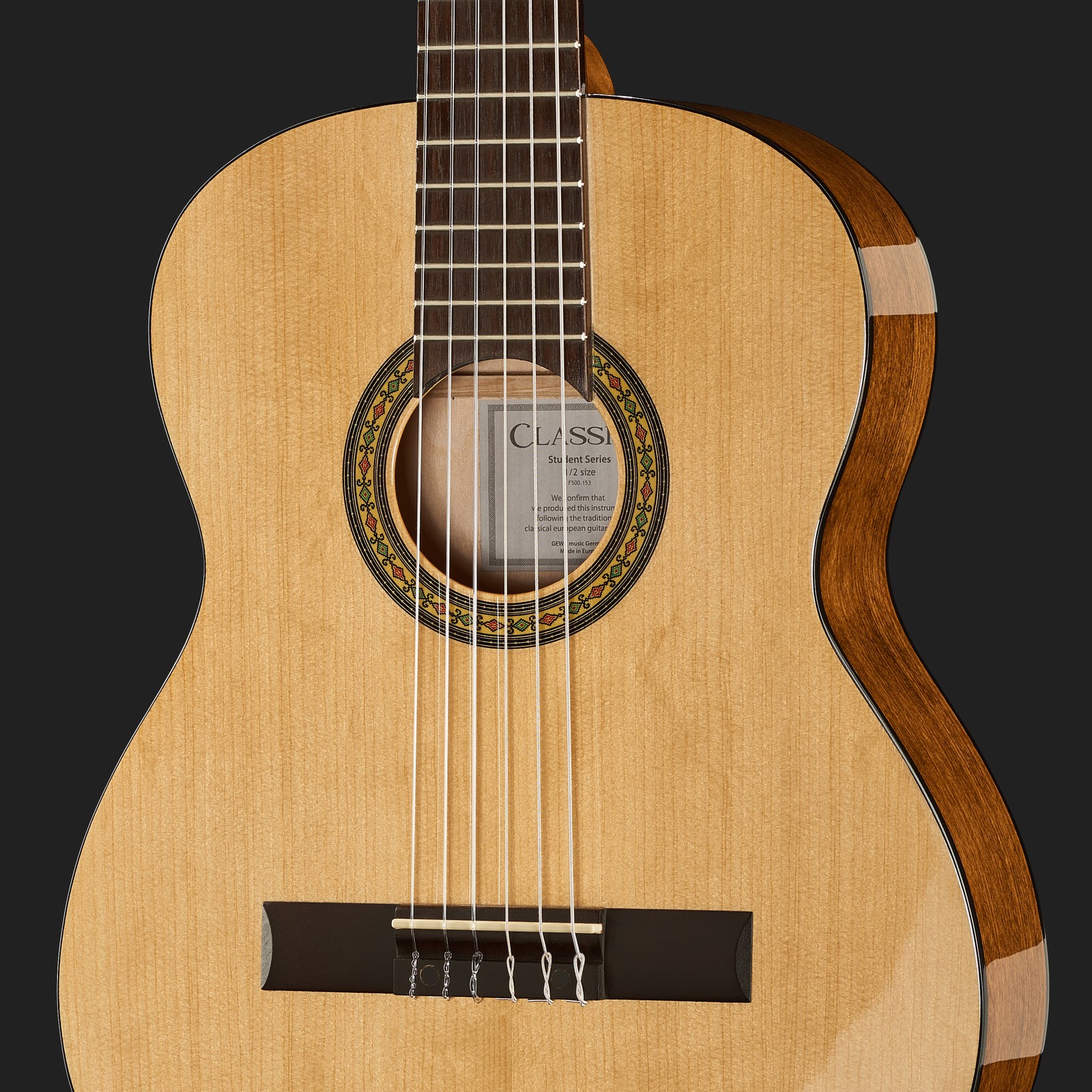 Die Thomann Classic 1/2 left ist eine Gitarre, die sich an die bewährte Vorlage hält. Der Korpus dieses in Europa gebauten Instruments besteht aus laminierter Buche, die Decke aus laminierter und getönter Fichte. Für den Hals wird Ahorn verbaut. Das Griffbrett ist mit 45 Millimetern schmaler als das einer normalen Klassikgitarre, und auch die Mensur fällt mit 52 Zentimetern deutlich kürzer aus. Vom Aufbau her ist sie somit eine typische Konzertgitarre für Linkshänder, nur rundum etwas kompakter gefertigt. Bauarttypisch kommt diese Gitarre ohne Gurtpins und ist somit für ein Spielen im Sitzen ausgelegt.