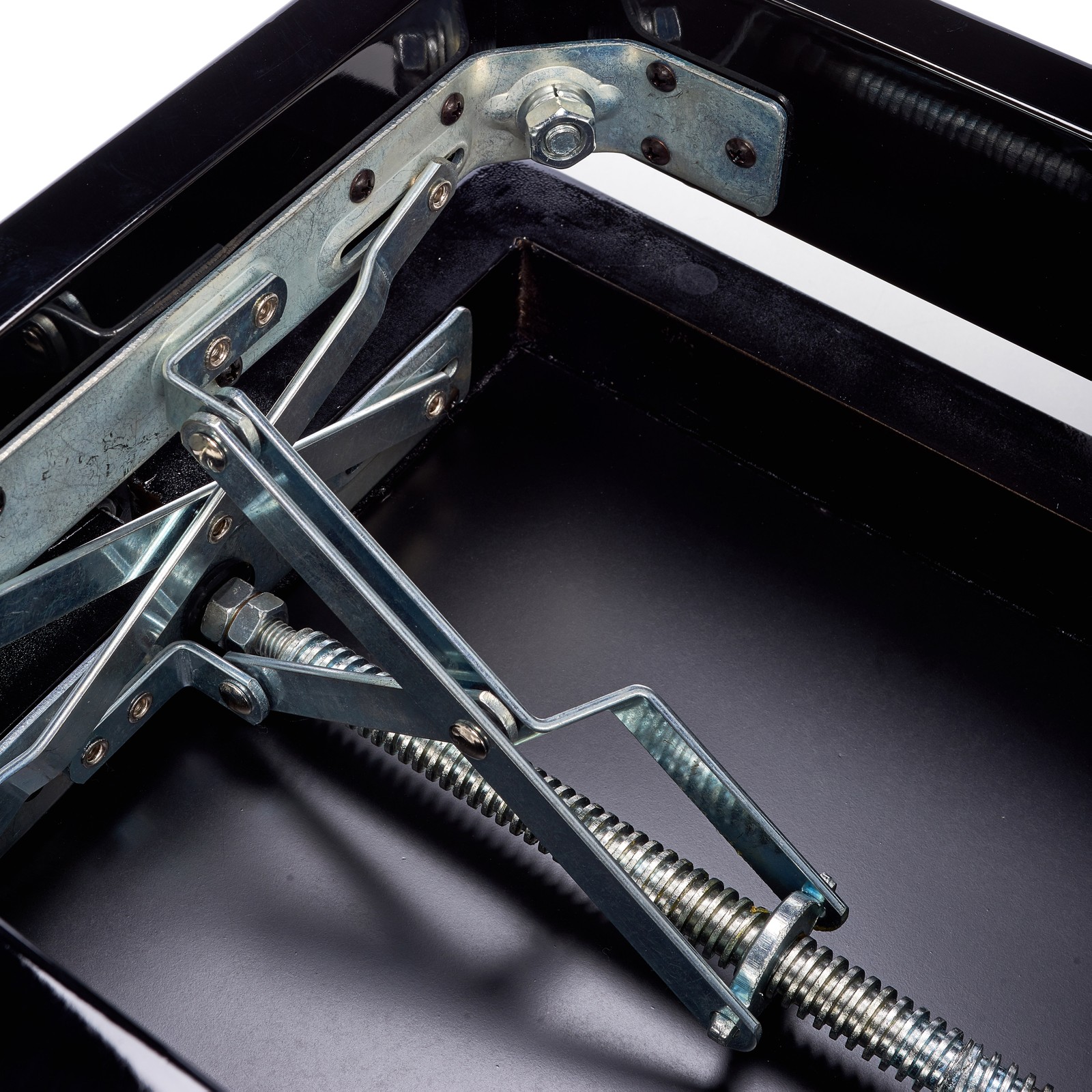 Bei der Thomann KB-247 sitzt man auf echtem Massivholz. Stufenlos zwischen 48,5 und 56cm in der Höhe verstellbar sind die rechteckigen, 435 x 285mm großen Sitzflächen, deren mit hochwertigem schwarzem Velours bezogene Polster in Holzrahmen eingelassen sind. Die Doppelkreuz-Präzisionshebewerke setzen für eine besonders gute Stabilität weit außen auf dem Unterbau auf und sind an zahlreichen Punkten, gestützt durch Metallplatten, mit Gestell und Sitzrahmen solide verschraubt. Nach dem Auspacken fixiert man zuerst die Beine der Klavierbank, wobei das für die kleine Aufbauaktion erforderliche Werkzeug bereits im Lieferumfang enthalten ist. Nach einiger Zeit sollten die Schrauben nachgezogen werden. Die 325mm tiefe und 960mm lange Bank wiegt 14kg.