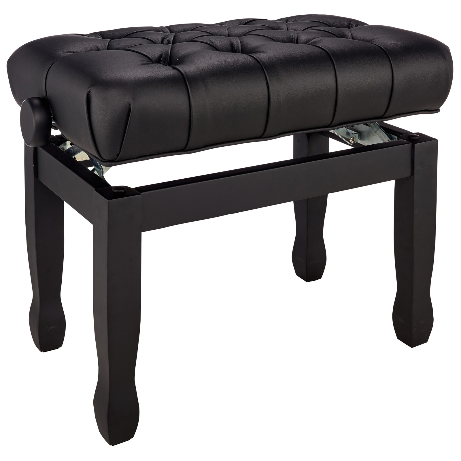 Die Klavierbank KB-87 ist ein günstiges Mittelklassemodell, das in seiner majestätischen Form auf ausdrucksstarken Beinen steht. Es überzeugt mit einer zu diesem Preis keineswegs selbstverständlichen Höhenverstellbarkeit, wobei die Sitzfläche im Gegensatz zur extrahohen KB-57 im üblichen Bereich variabel und im Vergleich zu einem Drehschemel nicht nur größer ist, sondern zudem eine konstante Spielposition gewährleistet. Beim Blick auf die preisgünstigere KB-47 fällt zuerst das Design mit Knopfheftung auf. Des weiteren nimmt man bei der etwas schwereren KB-87 auf einer größeren Sitzfläche mit Kunstlederbezug Platz, die in leicht reduziertem Umfang höhenverstellbar ist. Diese Pianobank, die übrigens in drei Gestellfarben zur Verfügung steht, ist in ihrer Preisklasse die einzige mit einer solch pompösen Anmutung. Das matte Schwarz der KB-87BM bildet eine Einheit mit der Sitzfläche. Es passt insbesondere zu ebensolchen Klavieren oder Flügeln. Schmutzunempfindlich fügt es sich in das vorhandene Interieur ein, ruft im Rampenlicht keine unerwünschten Reflexionen hervor und vor allem: Es passt zu jedem Outfit.