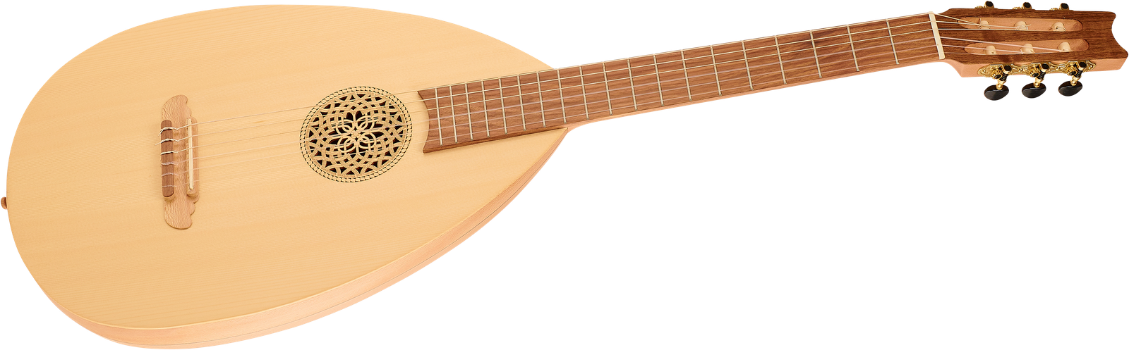 Die Gitarrenlaute war am Anfang des letzten Jahrhunderts eines der am weitesten verbreiteten Musikinstrumente im deutschen Sprachraum und wurde sogar lange als das Nationalinstrument der Deutschen bezeichnet. Die Thomann Lute Guitar besitzt die typischen Merkmale und den charakteristischen Klang dieses traditionellen Instruments. Dazu gehören etwa ein Rundbauchkorpus, ein Griffbrett und ein Saitenhalter aus Ahorn sowie eine Fichtendecke, die mit ihrem fein verzierten Schallloch historischen Charme versprüht. Anders als bei der ursprünglichen Laute, sind die Nylonsaiten der Thomann Lute Guitar wie bei einer normalen Gitarre in EADGHE gestimmt, sodass Gitarristen das Instrument ohne zusätzlichn Aufwand spielen können.
