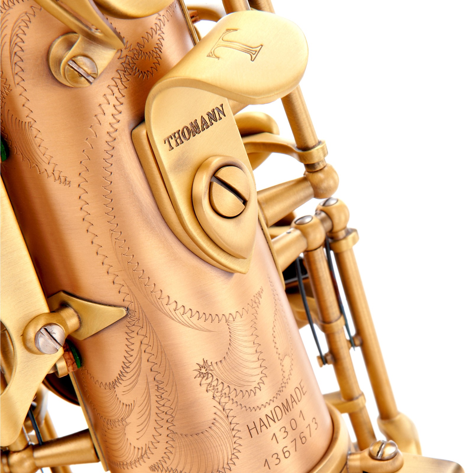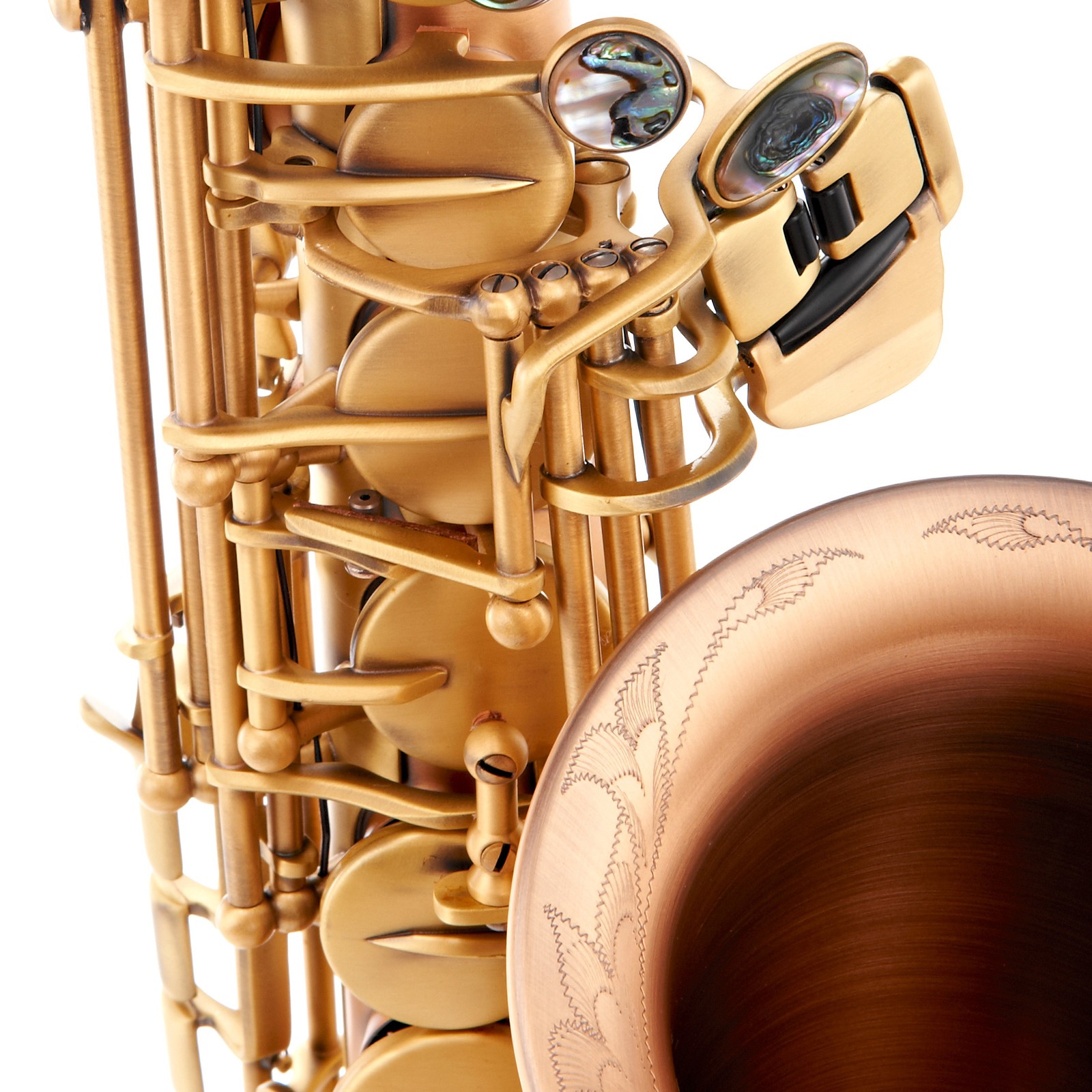 Das Thomann MK IV Handmade Altsaxophon überzeugt aufgrund seiner ausgewogenen Intonation in allen Lagen und bietet eine sehr gute Ansprache. Gemeinsam mit dem Kupferkorpus sorgen die auf den Lederpolstern aufgesetzten Metallresonatoren für einen warmen und gedeckten Klang, der zuweilen an ältere amerikanische Saxophone erinnert. Korpus und S-Bogen bestehen aus Kupfer, Klappen und Mechanik werden aus Messing hergestellt. Eine elegante Kunstgravur ziert sowohl den Korpus als auch den S-Bogen. Die echten Abalone Perlmutteinlagen in den Klappen sind ein wahrer Hingucker. Aufgrund seiner hochwertigen Verarbeitung eignet sich das MK IV sehr gut als verlässliches Einsteiger- und Schülerinstrument. Im Lieferumfang sind ein Gigbag mit Rucksackgarnitur, ein Mundstück, ein Tragegurt und ein Putztuch enthalten.