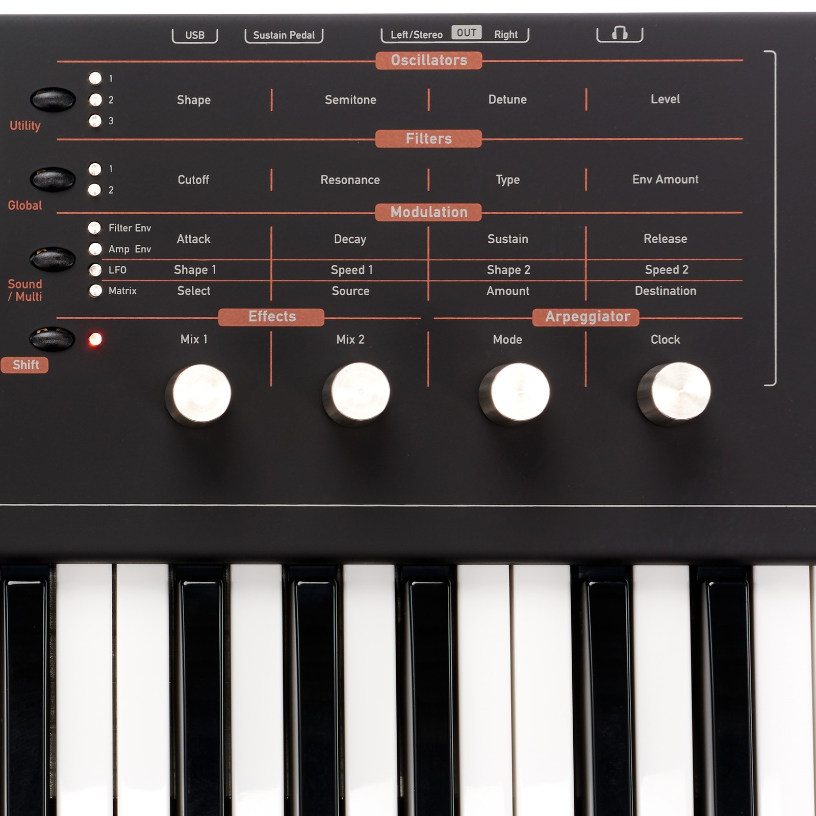 Von sanften Pads über kraftvolle Bässe bis hin zu knackigen Lead-Sounds - das Blofeld Keyboard bietet durch seine 68 Wellenformen zahlreiche Sounds, die unterschiedlicher nicht sein könnten. Das monochrome und grafikfähige Display bietet eine übersichtliche Auswahl an Sounds über eine Bedienung des Endlosreglers. Das Blofeld-Keyboard ist mit bis zu 25 Stimmen polyphon. Was es außerdem auszeichnet, ist die robuste Bauweise und sein ansehnliches Design: Es verfügt über Regler aus Edelstahl und ist in einem stabilen schwarzen Metallgehäuse verbaut. Die Anschlüsse befinden sich auf der Rückseite, wo es einen Stereo- und einen Kopfhörer-Ausgang sowie auch einen Anschluss für ein Pedal gibt, mit dem sich die Noten halten lassen, indem es gedrückt gehalten wird.