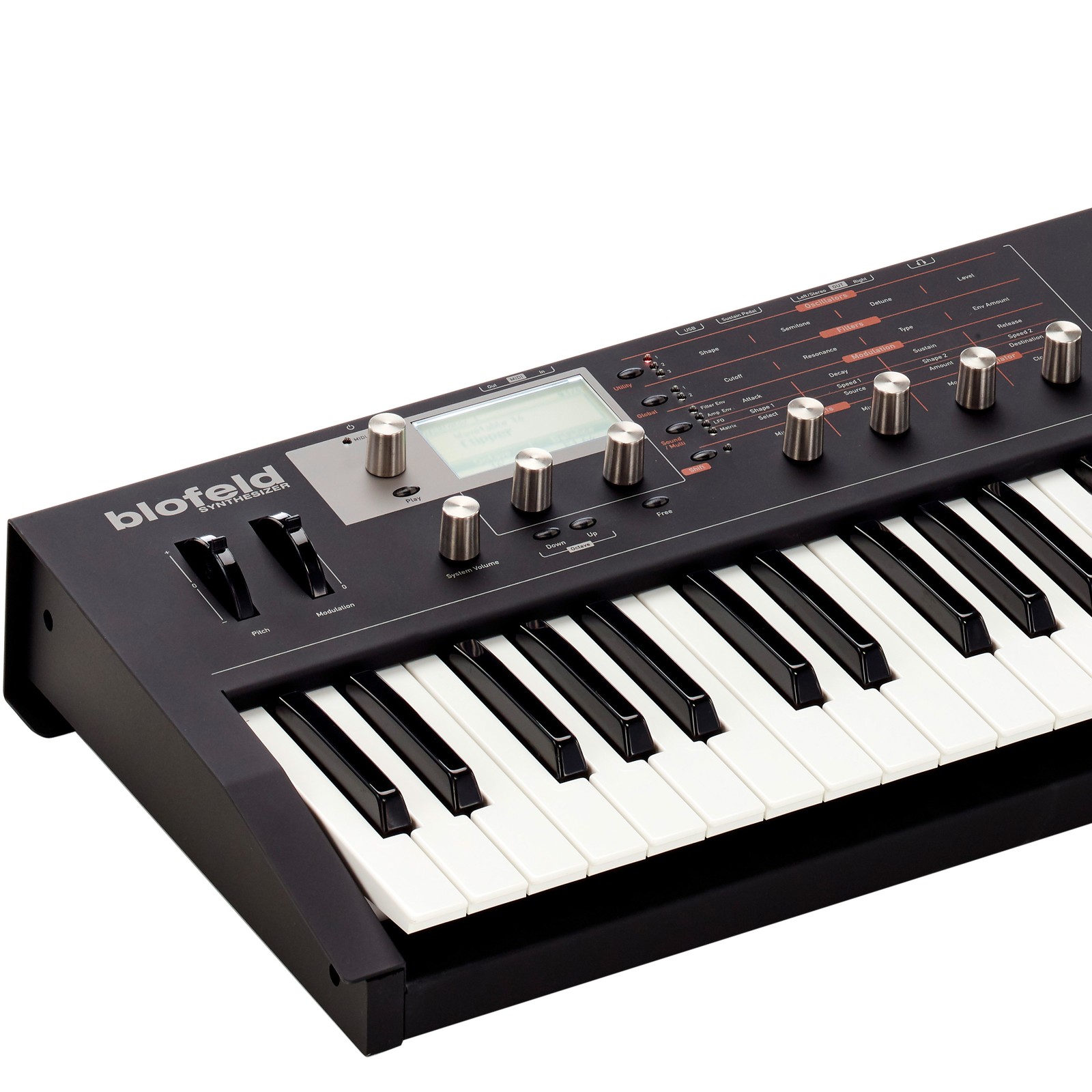 Jeder der Oszillatoren sowie der Rauschgenerator und der Ringmodulator lassen sich frei mit den beiden separaten Multimode-Filtern mischen. Das Display zeigt die jeweilige Konfiguration dank eines dafür vorgesehenen Modus übersichtlich an. Unter den vier ADSR-Hüllkurven lässt sich einstellen, ob die Haltephase ignoriert werden soll, während sich drei LFOs mit einem Delay versehen lassen. Mit der Parametermatrix des Blofeld-Keyboards sind zahlreiche Modulationen möglich. Sobald eine Taste der Matrix gedrückt wird, erscheint auf dem Display eine Auswahl an Parametern, die beliebig verändert werden kann. Hier lassen sich bis zu vier Makros als sogenannte Modifier definieren, um eigene Modulationsquellen zu erstellen. Darüber hinaus sind die Sounds des Blofeld-Keyboards durch seinen 60-MB-Sample-Flash-Speicher mit zusätzlich erhältlichen Soundsets des Herstellers Waldorf erweiterbar.