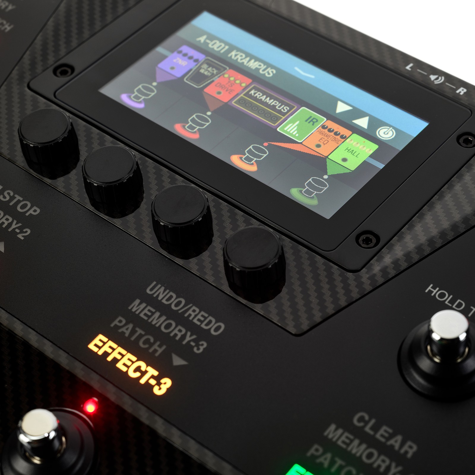 Das futuristische Äußere des Zoom G6 macht dieses Multieffektgerät für E-Gitarristen nicht nur zu einem echten Hingucker auf der Bühne und im Proberaum. Es deutet auch an, was bei diesem schwarzen Effektprozessor mit Carbon-Optik unter der Haube steckt. Sein softwarebasiertes Bedienkonzept wird über einen 4,3"-Touchscreen umgesetzt, Wischgesten und Drag-and-Drop inklusive. Um den perfekten Gitarrensound für sich zu erstellen, finden Musiker hier nicht nur nahezu alle bekannten Zoom-Sounds und -Effekte, sondern auch ein USB-Audiointerface, einen externen Effekt-Loop, einen integrierten Drum-Computer und Klang-Emulationen bekannter Amps und sogar 70 Impulsantworten für eigene Soundkreationen. Steuern lässt sich das Effektboard mit Touchscreen, Drehreglern, sechs metallenen Fußschaltern im Stomp-Box-Style und mit einem integrierten Expression-/Volume-Pedal, das mit einer gummierten Trittfläche aufwartet.
