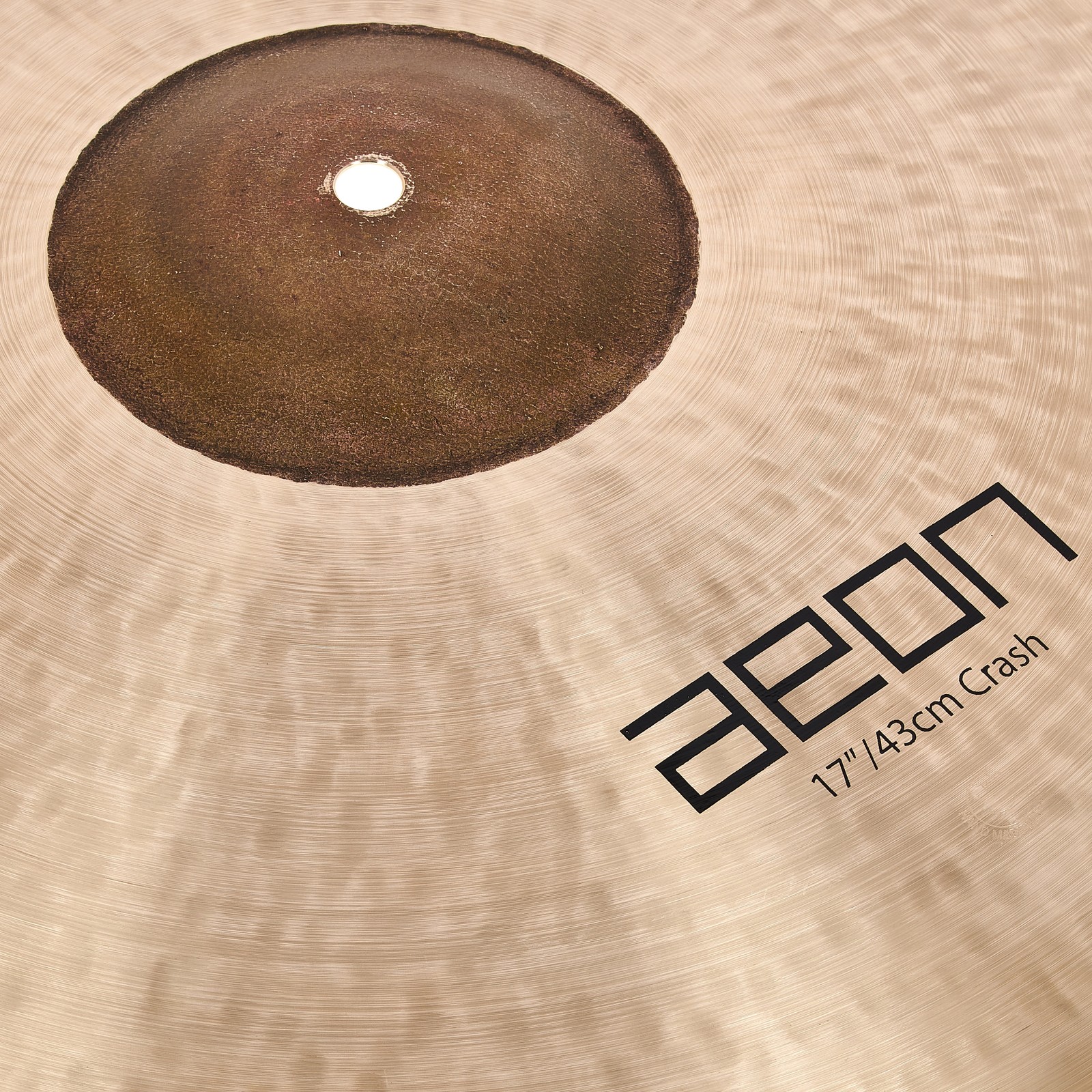 Das breit gefächerte Programm der Aeon-Serie umfasst diverse Ride- und Crashbecken jeweils in leichter und mittelschwerer Ausführung, zwei verschieden große Hi-Hats sowie eine Reihe von Effektbecken. Damit ist die ganze Bandbreite abgedeckt, die man als Drummer heutzutage braucht. Während sich die Light Rides und die Thin Crashes überall dort wohlfühlen, wo auch bei leisen Anschlägen das volle Klangpotenzial zur Entfaltung kommen soll, können die regulären Versionen auch kräftigere Schläge vertragen und sind damit durchaus auch tauglich für Rockmusik, sofern sie nicht allzu laut ist. Das 17“ Aeon Crash verfügt über einen warmen Sound mit feinen Höhen und eine große dynamische Bandbreite mit schneller Ansprache. Aufgrund dieser Attribute ist von Rock und Pop über Blues, Soul und Funk bis hin zu Latin Music mit diesem Becken alles möglich.